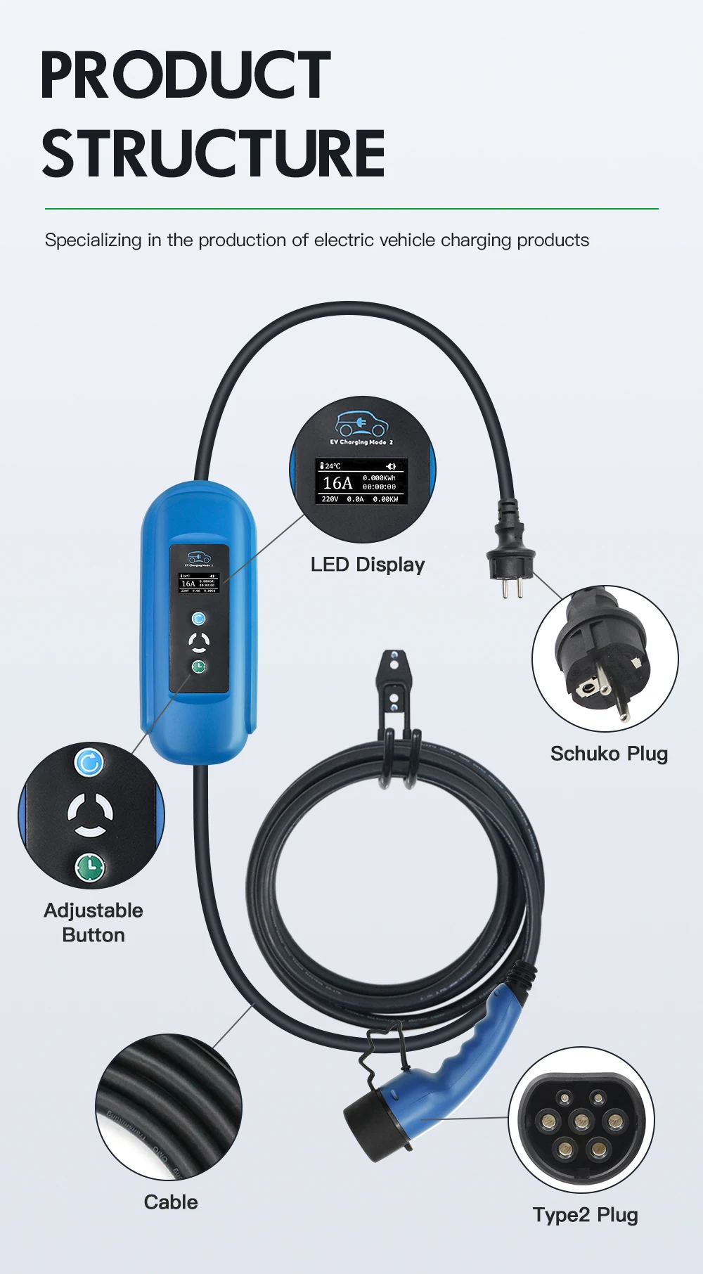 Уровень 2 EV Зарядное устройство Тип 2 16A 11kw вилка CEE EVSE EV з...