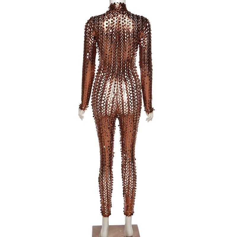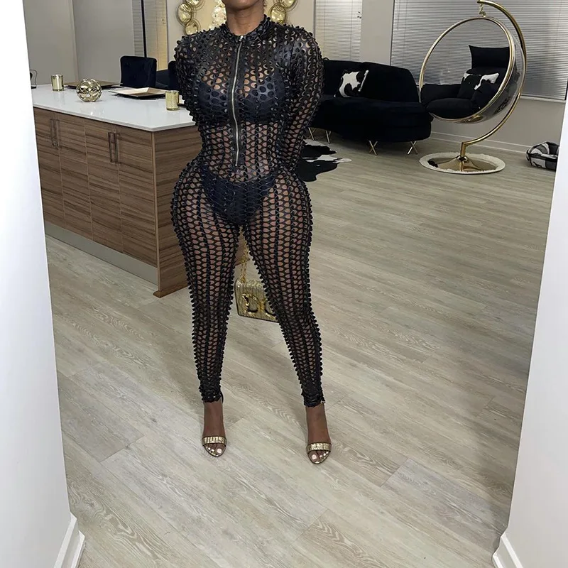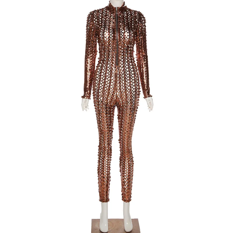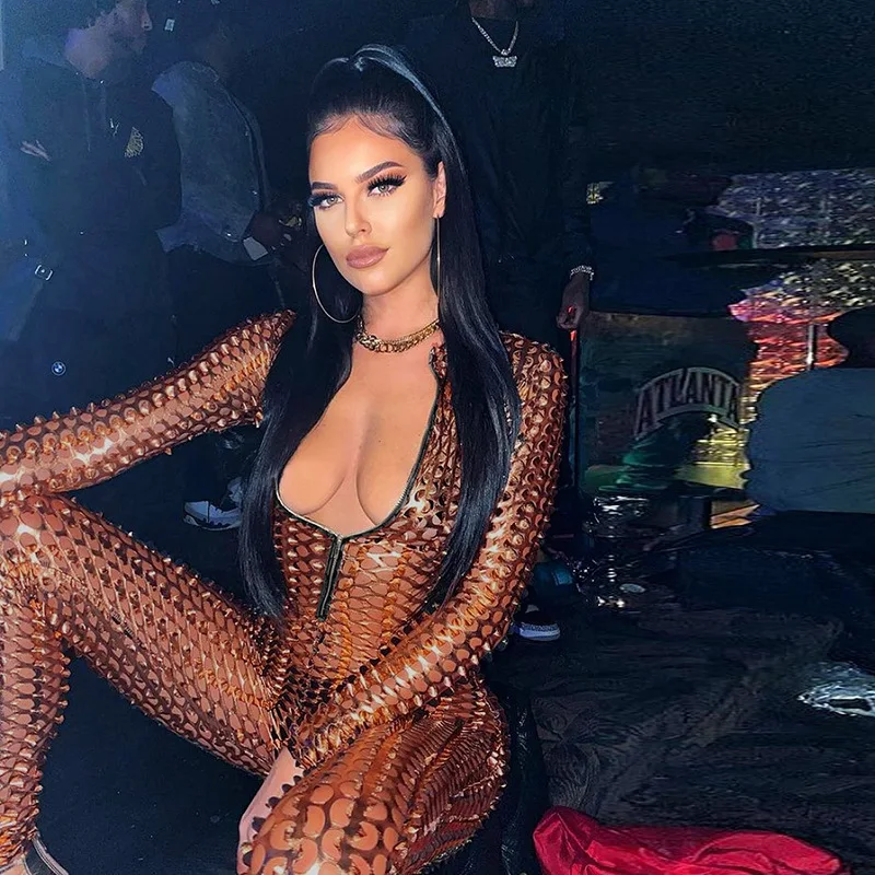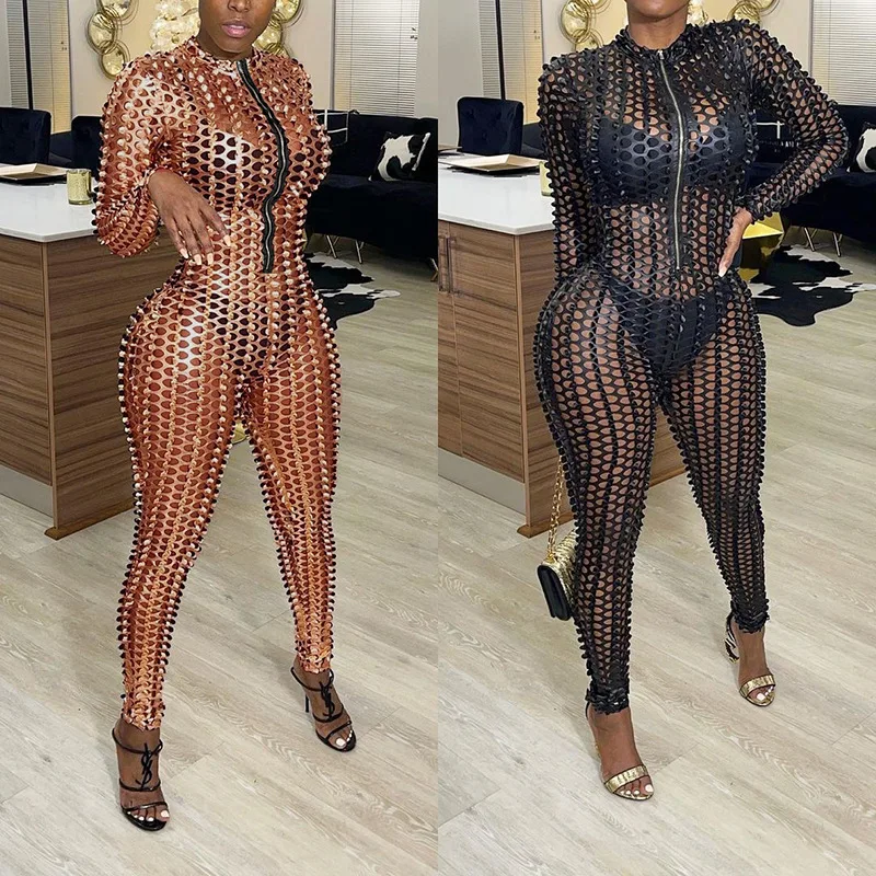 Сексуальный прозрачный комбинезон с вырезами, женский комбинезон на молнии с V-образным вырезом, брюки-карандаш, облегающие черные, коричневые Клубные комбинезоны, женский комбинезон icon star icon star icon star icon star icon star