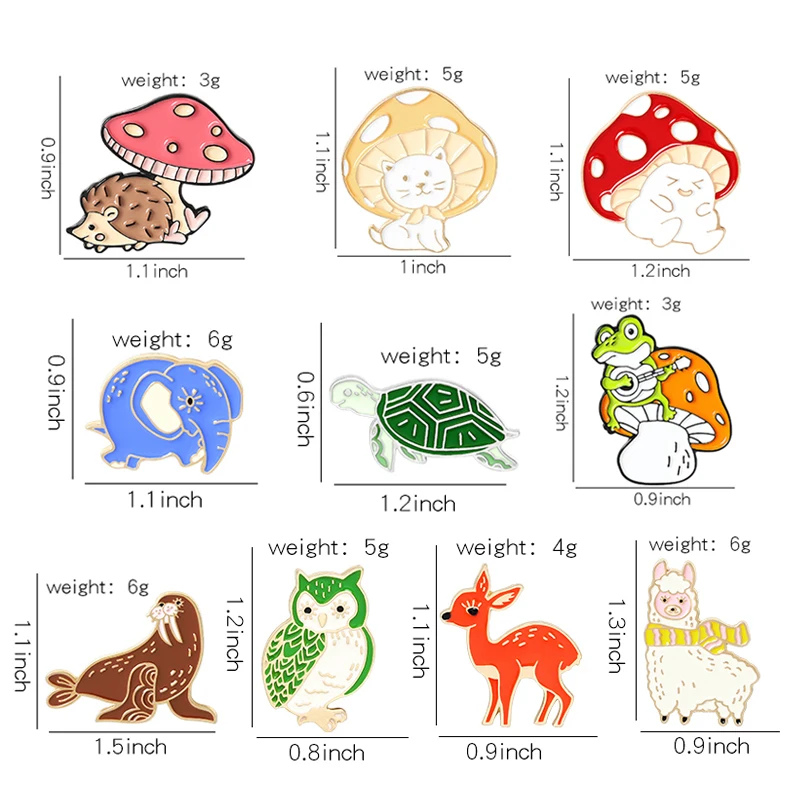 Милые эмалированные булавки в форме грибов, лягушки, ежика, кролика...