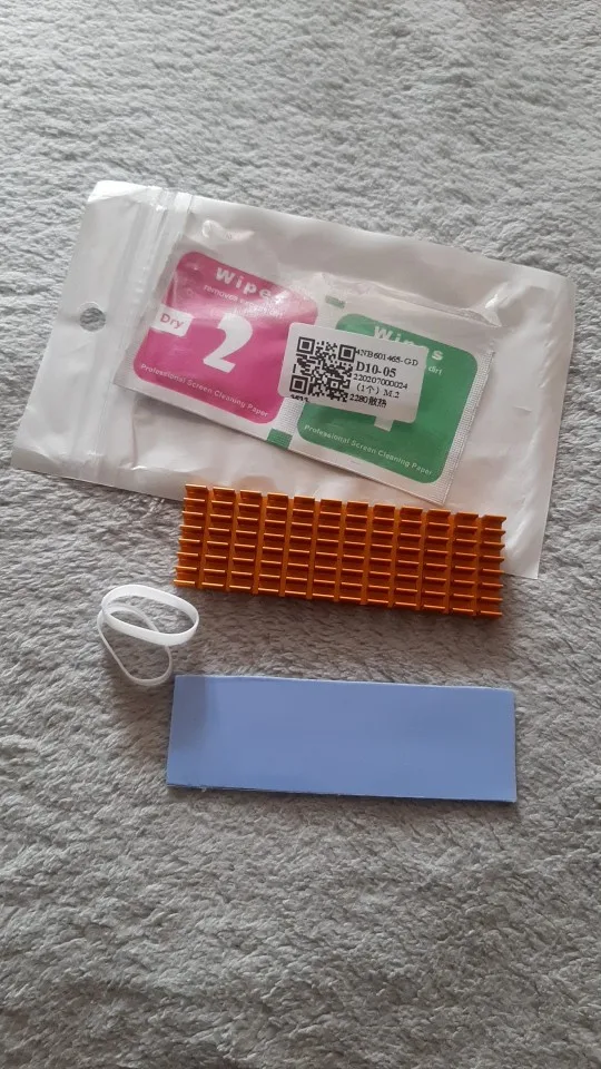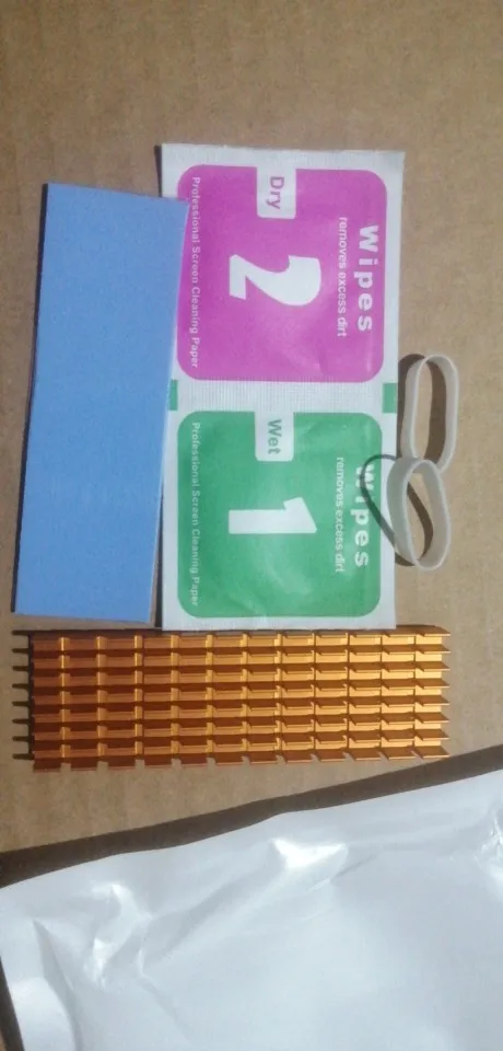радиатор прибыл, установил его на м2 температура снизилась, в комплекте влажная и сухая салфетки, и термо прокладка - самоклейка, ещё две резинки, все целое