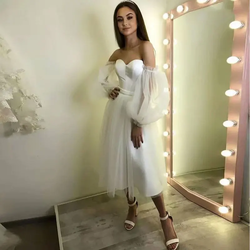 Короткое свадебное платье с пышными рукавами и воротником в виде сердца, свадебное платье для невесты, атласное женское платье на шнуровке
