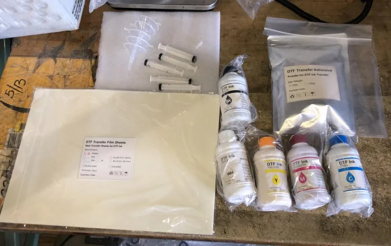 1.DTF чернил и лекарственных средств (FDA A3 пленки: ① 5 цветов 250 мл DTF чернила K C M Y WH ② 0,5 кг DTF пудры ③ 50 шт. A3 ПЭТ-пленка