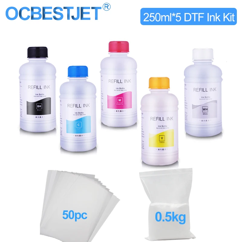 2.DTF чернил и лекарственных средств (FDA A4 пленки: ① 5 цветов 250 мл DTF чернила K C M Y WH ② 0,5 кг DTF пудры ③ 50 шт. A4 ПЭТ-пленка