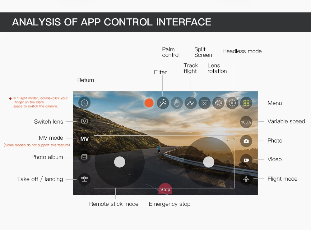 Подъем и спуск, поворот влево и вправо, вперед, назад, влево и вправо, быстрый и медленный контроль скорости, возврат одной кнопки в дом, Безголовый режим, фиксированная высота оптического потока и фиксированная точка, фото жестов, видео жестов, опыт выполнения функции. Переключатель двойной камеры