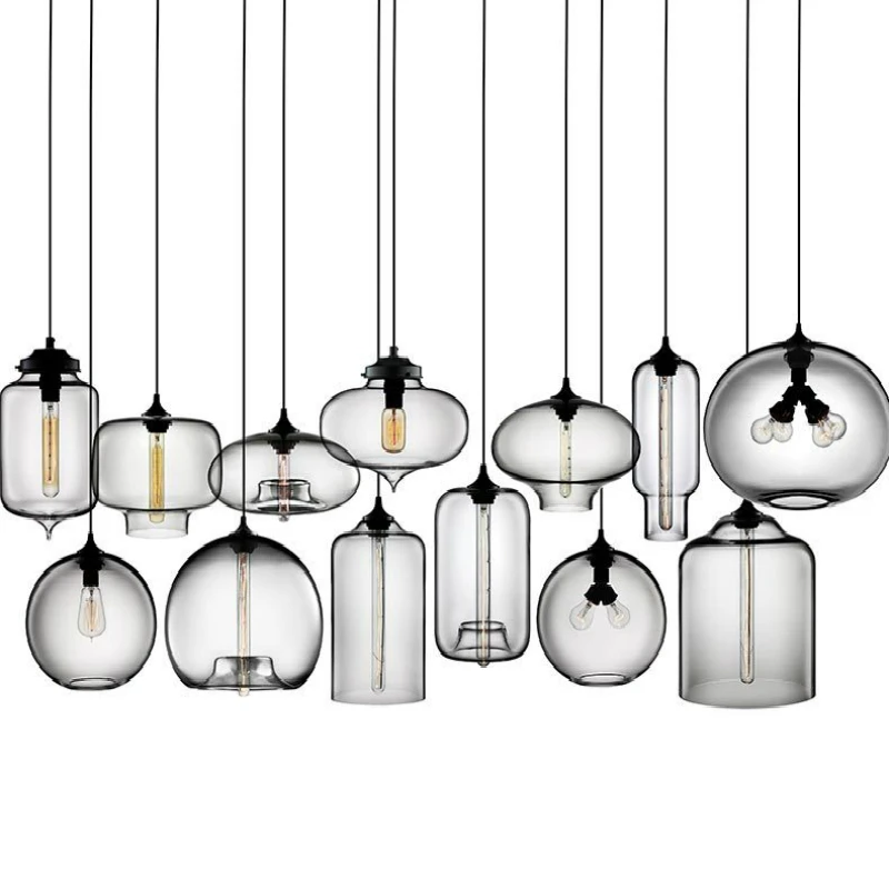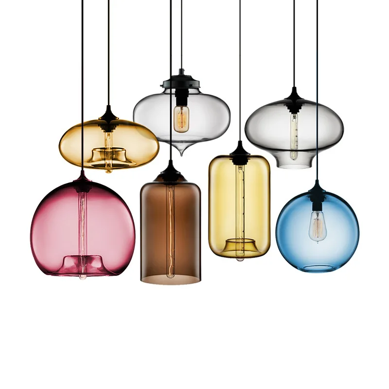 Светильник источник: E27 (лампочки не входят в комплект)7 цветов: красный/розовый красный/синий/прозрачный/дымчатый серый/янтарный/кофейный цветНапряжение: 90-260 ВМатериал: железо + стекло
