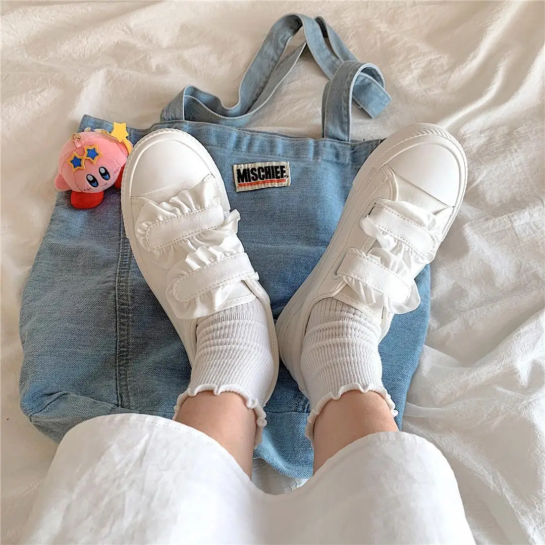 Женские кроссовки Kawaii Lolita, белые, с кружевом, на липучке, плюшевые, на плоской подошве, весенние, повседневные, теннисные, 2021