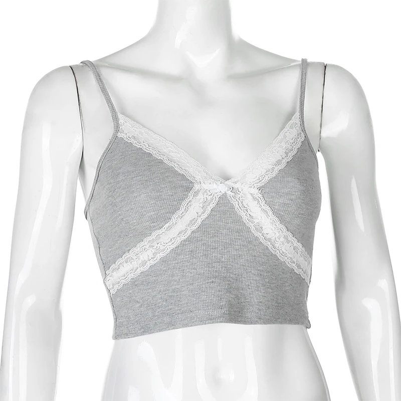 Женский укороченный топ на тонких бретельках, с глубоким V-образным вырезом и кружевом