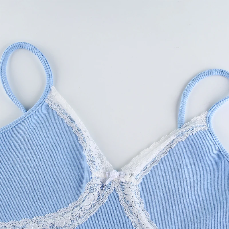 Женские топы на тонких бретельках с глубоким v-образным вырезом и кружевом Y2K Chic 90s, летние ребристые топы с открытой спиной 90s, синие топы, уличная одежда