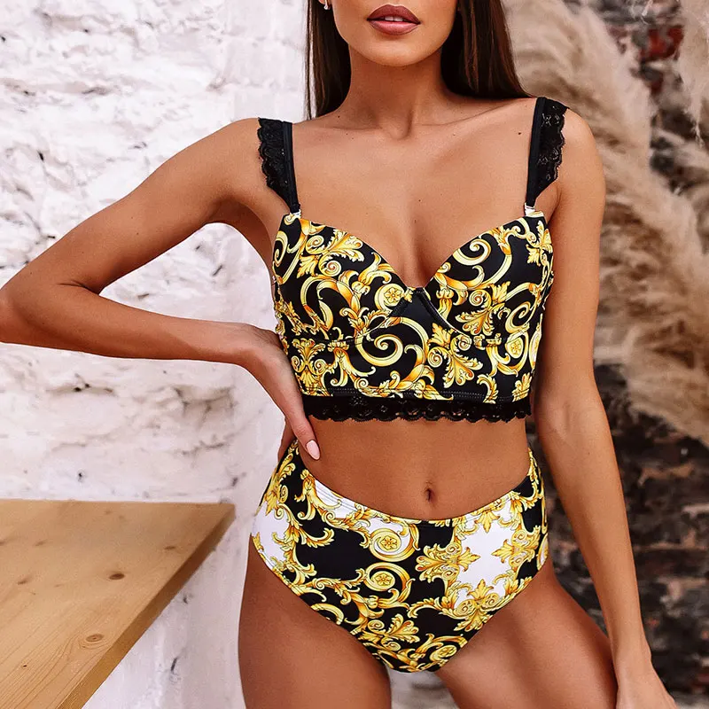 2021 сексуальный винтажный принт женские бикини комплект кружевной ...