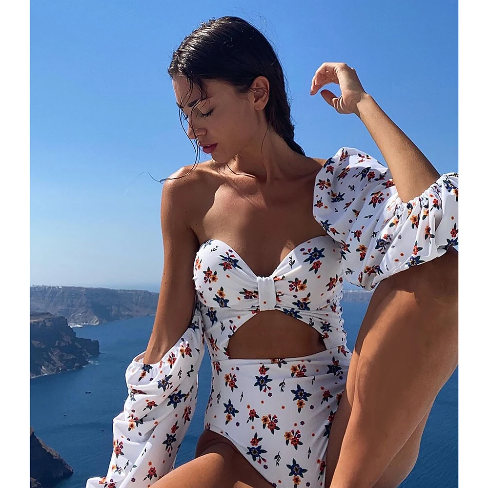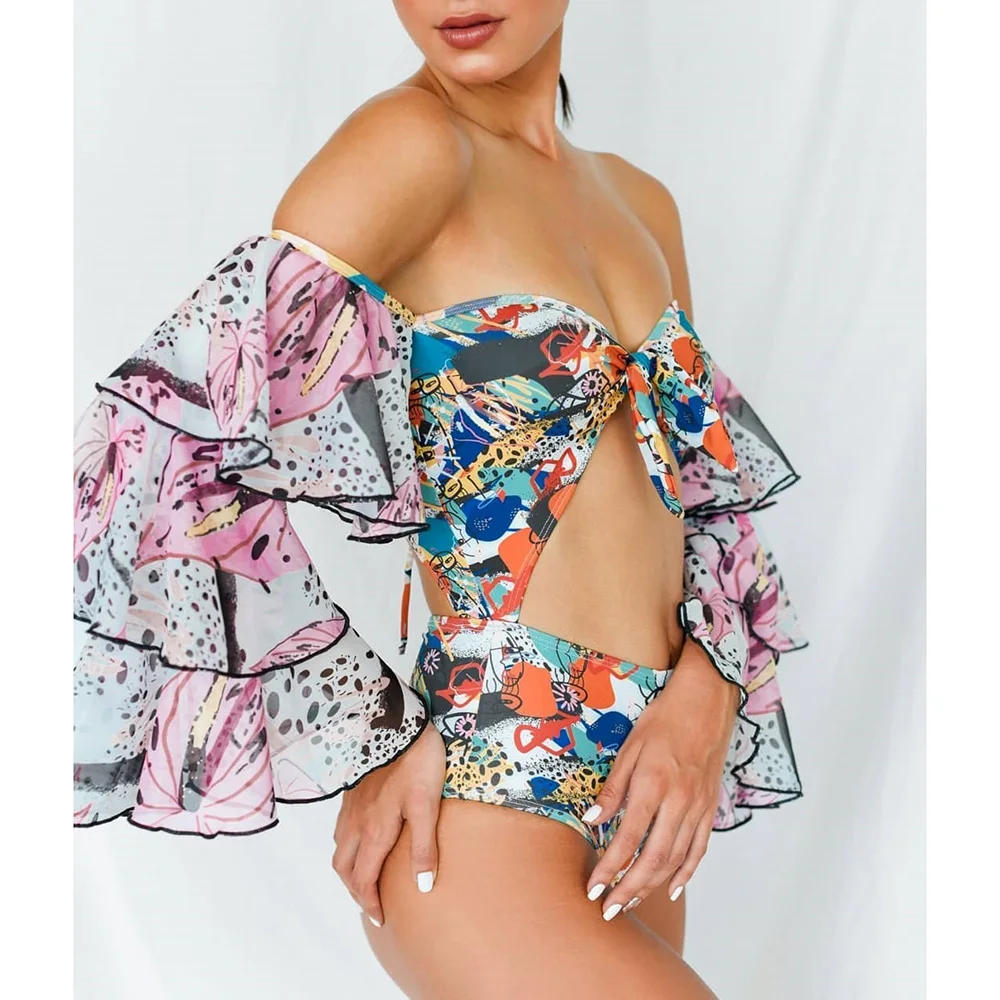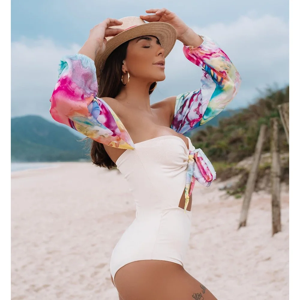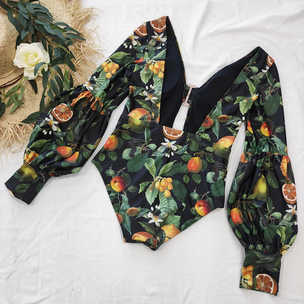 Сексуальный слитный купальник 2021, купальники с длинным рукавом, Женское боди с принтом и открытой спиной, женский купальный костюм со шнурками