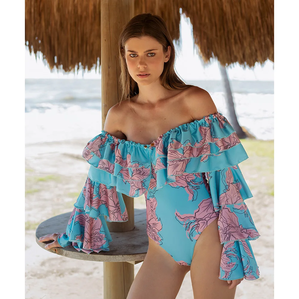 Купальник скорее подойдёт не для плавания , а для прогулки по пляжу с сочетанием с шортами или юбкой. Купальник слитный но с открытым животом. Без бретелей , бандо. Рукава обьемные воздушные . У продавца большой выбор красивых расцветок и сочетаний.