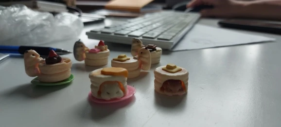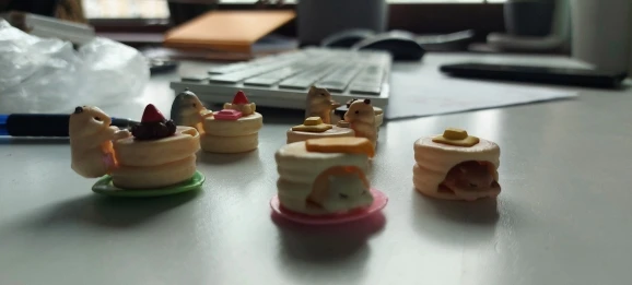 Милый комплект пластмассовых милых хомячков. Все пришли целые, хорошая покраска, нет брака. Пришли в Москву относительно быстро, за две недели. Каждый хомячок со своим блинчиком и добавкой в виде клубнички и мусса в отдельных упаковках. Смотрятся прелестно друг с другом, можно ставить их как отдельно, так и друг на друга, так же на один блинчик можно добавить двух хомячков, будто они едят один блинчик)