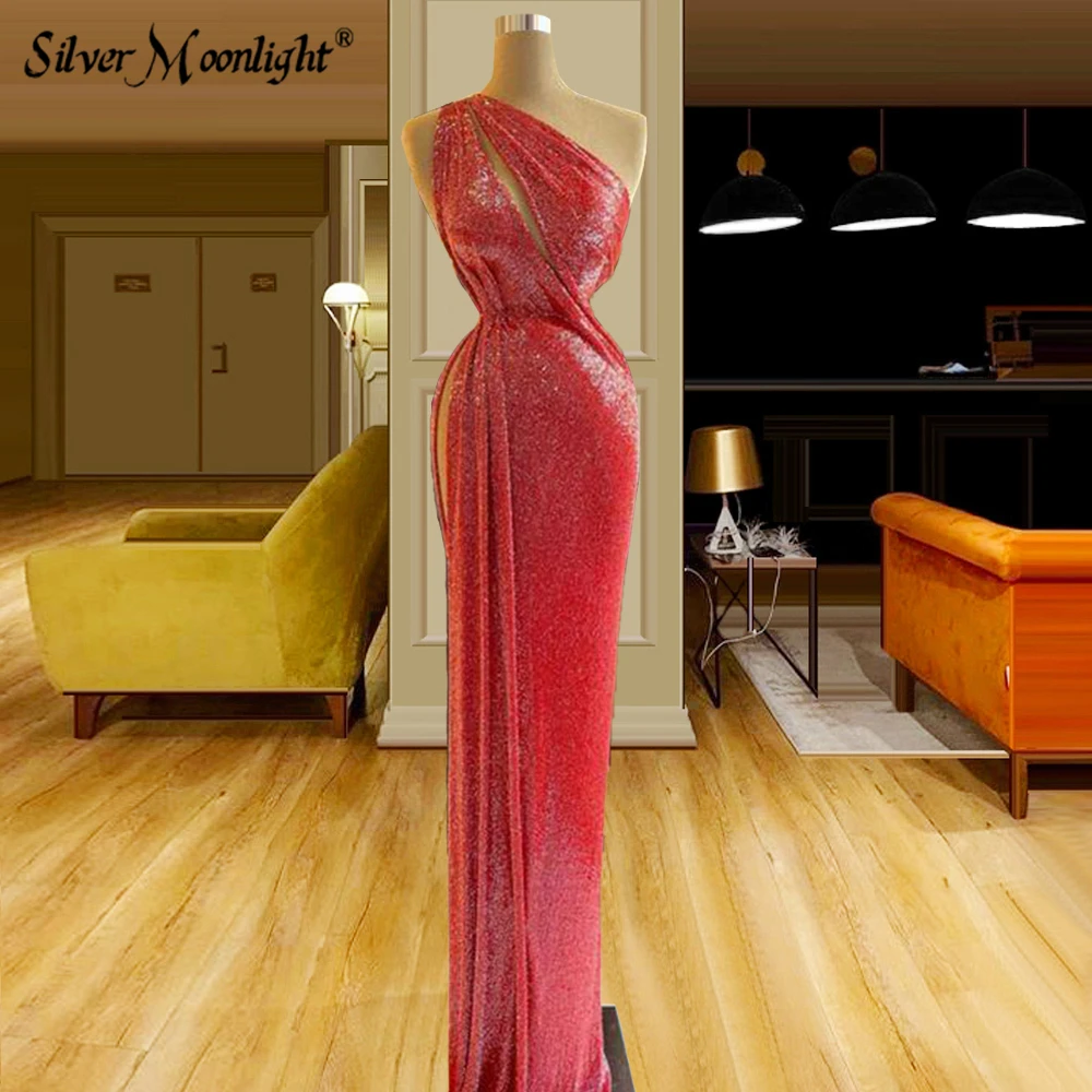 Сексуальные платья русалки с высоким разрезом на одно плечо, красные платья для выпускного вечера с рюшами, блестящими блестками, длинные женские вечерние платья