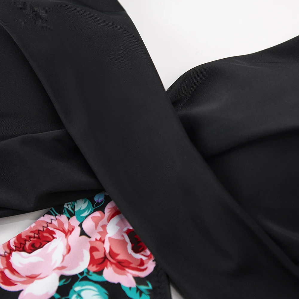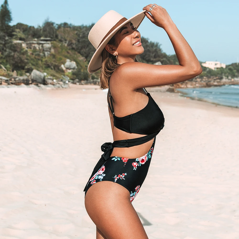 Создайте пляжное заявление в нашем черном и цветочном слитном купальном костюме с вырезами. Имеет переднюю обертку, которая завязывается сзади с умеренным дерзким покрытием. Вырезы создают иллюзию высокой посадки.