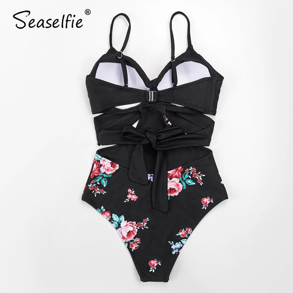 SEASELFIE черный цветочный вырез цельный купальник для женщин сексуальные литые чашки пуш-ап Монокини купальник 2022 купальный костюм Пляжная одежда