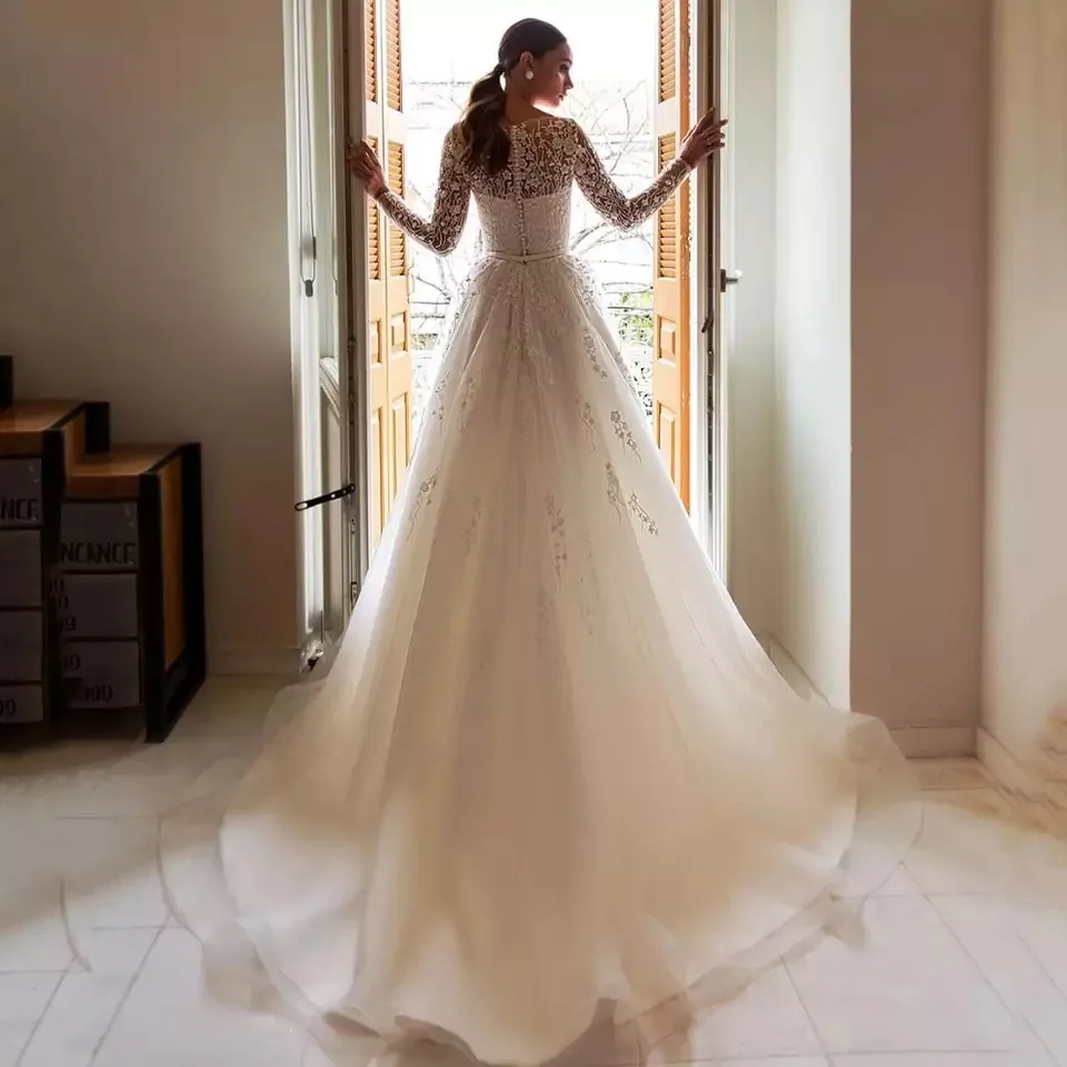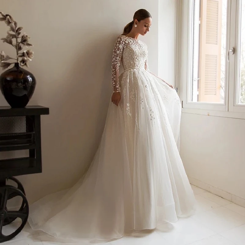 Свадебные платья с длинными рукавами, кружевное винтажное платье-трапеция из тюля с круглым вырезом и аппликациями, со шлейфом, 2021