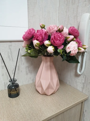 Быстрая доставка. Его пластик так хорошо, потому что он не будет тормозить. Выглядит современный. Если вы хотите поместить в него больше цветов, я рекомендую заполнить их наполовину водой, иначе она упадет (из-за пластика, она не такая стабильная, как стекло).