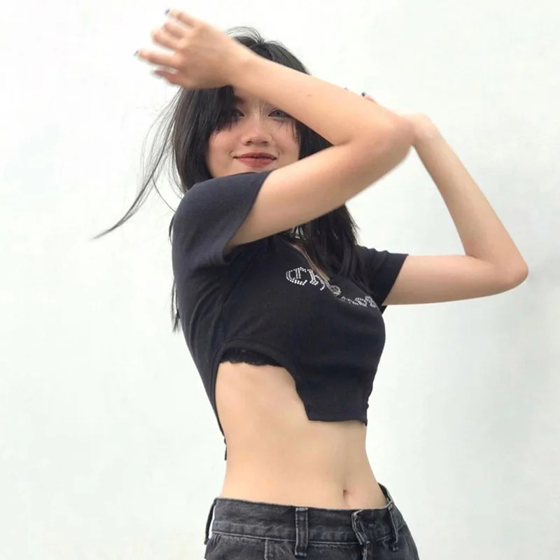 Топ с принтом аниме для женщин футболки с короткими рукавами футболка с принтом сохранения внешнего вида и круглым вырезом Стразы футболки свободного покроя черный кроп-налив жидкости для электронных девушка Y2K одежда