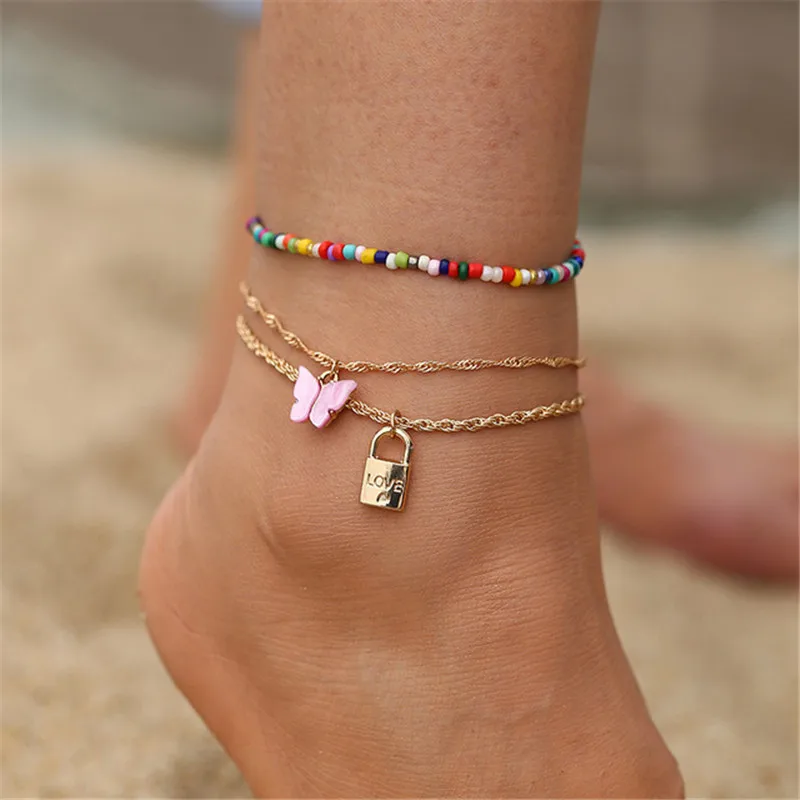 2021 новый многослойный бабочка низкой цене Женская мода тренд золотым замком, расшиты разноцветными бусинами и ножные браслеты браслет на ногу пляж, ювелирные изделия в качестве подарка
