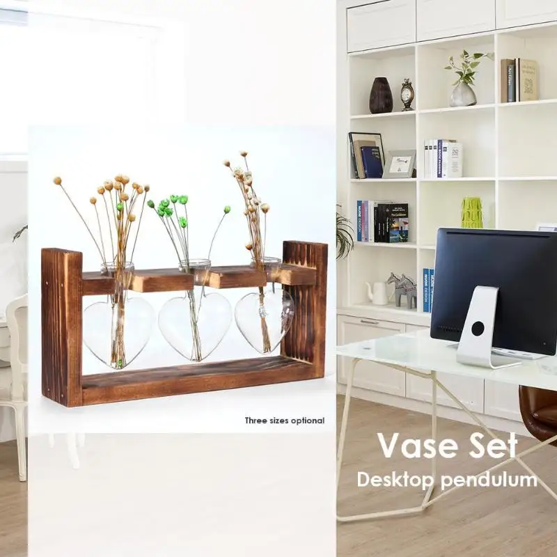Ваза Стеклянная в форме сердца, ваза для гидропонных растений с деревянной рамкой, винтажный цветочный горшок, настольный бонсай, ваза для цветов, украшение для дома