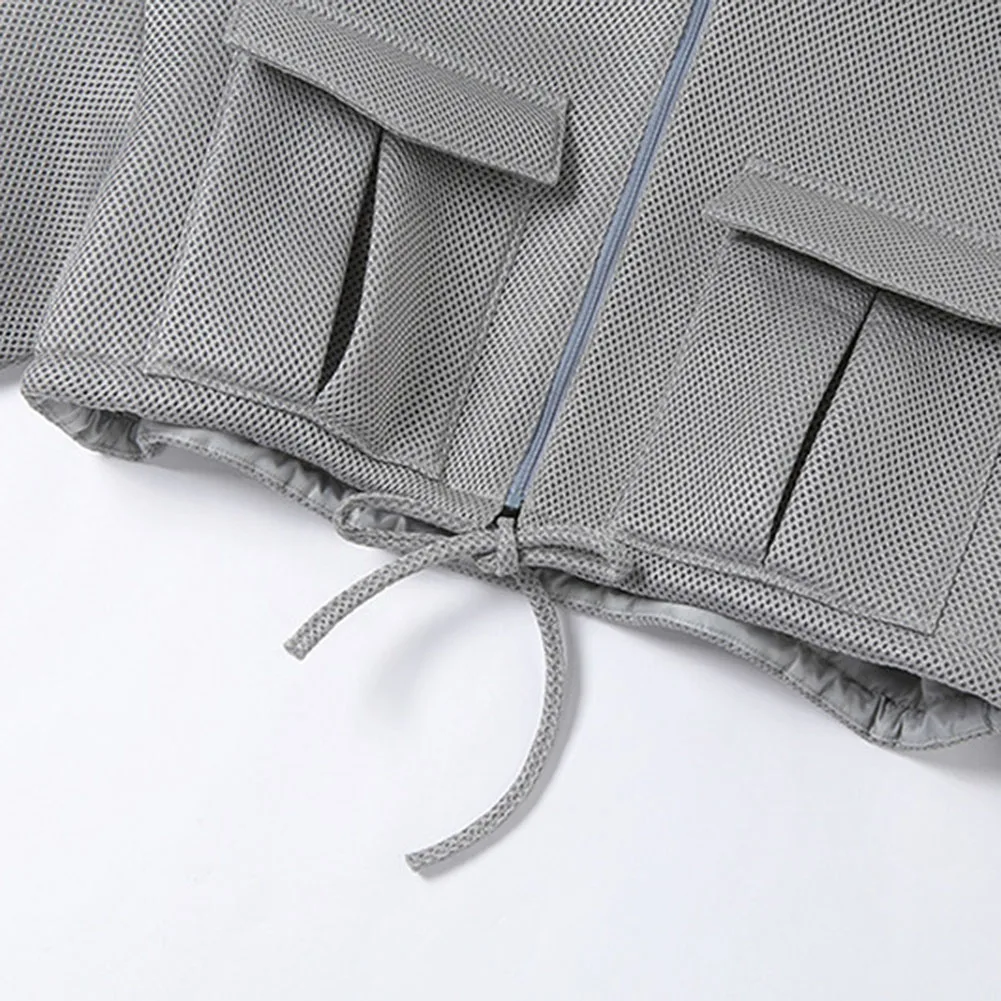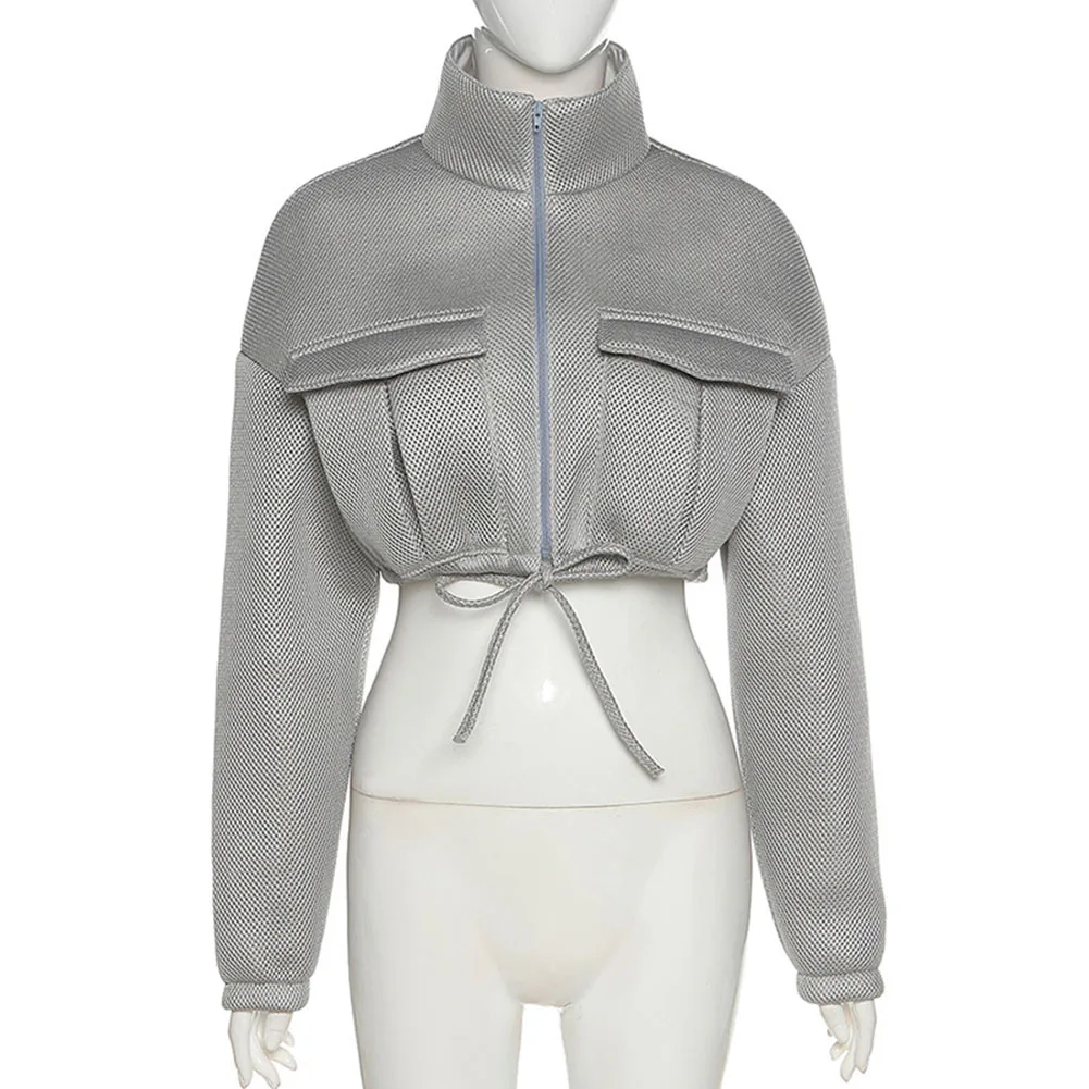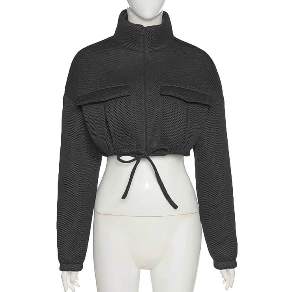 Куртка женская клетчатая с высоким воротником, укороченный приталенный пиджак на молнии, с сетчатыми карманами, на шнуровке, верхняя одежда с кулиской, уличная одежда