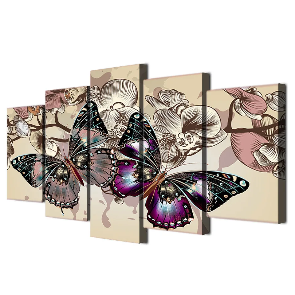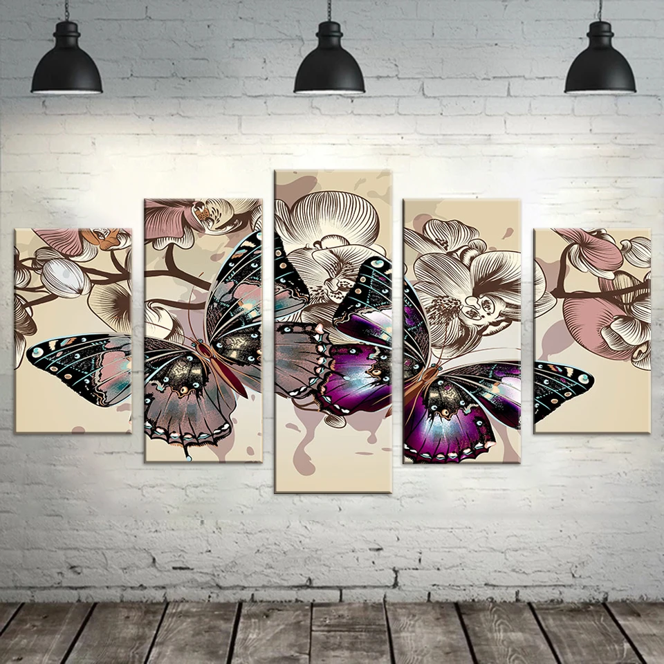 Модульные картины на холсте HD, картины для гостиной, настенные рамки, 5 шт., цветы картины с бабочкой, Декор для дома постеры с животными