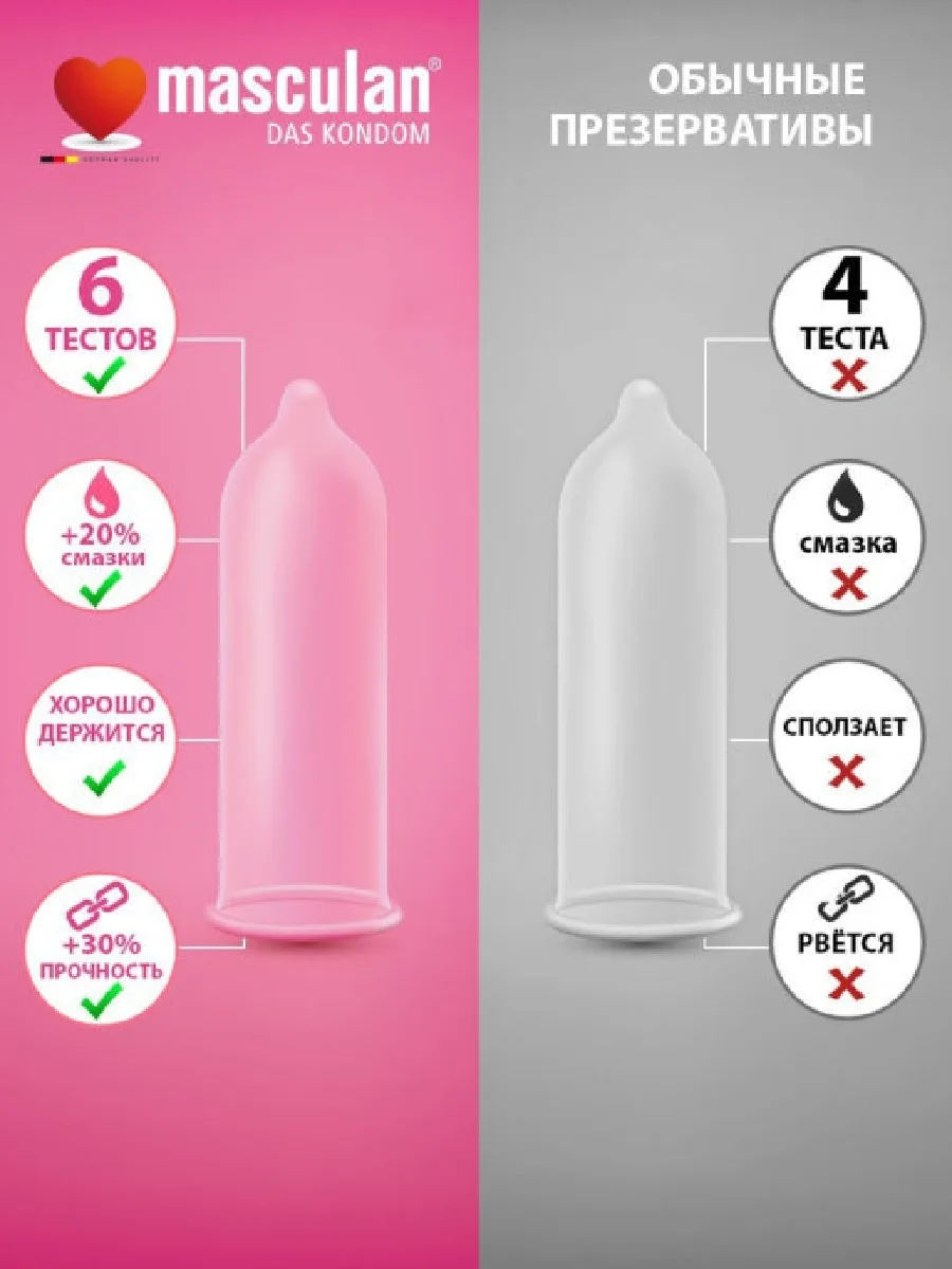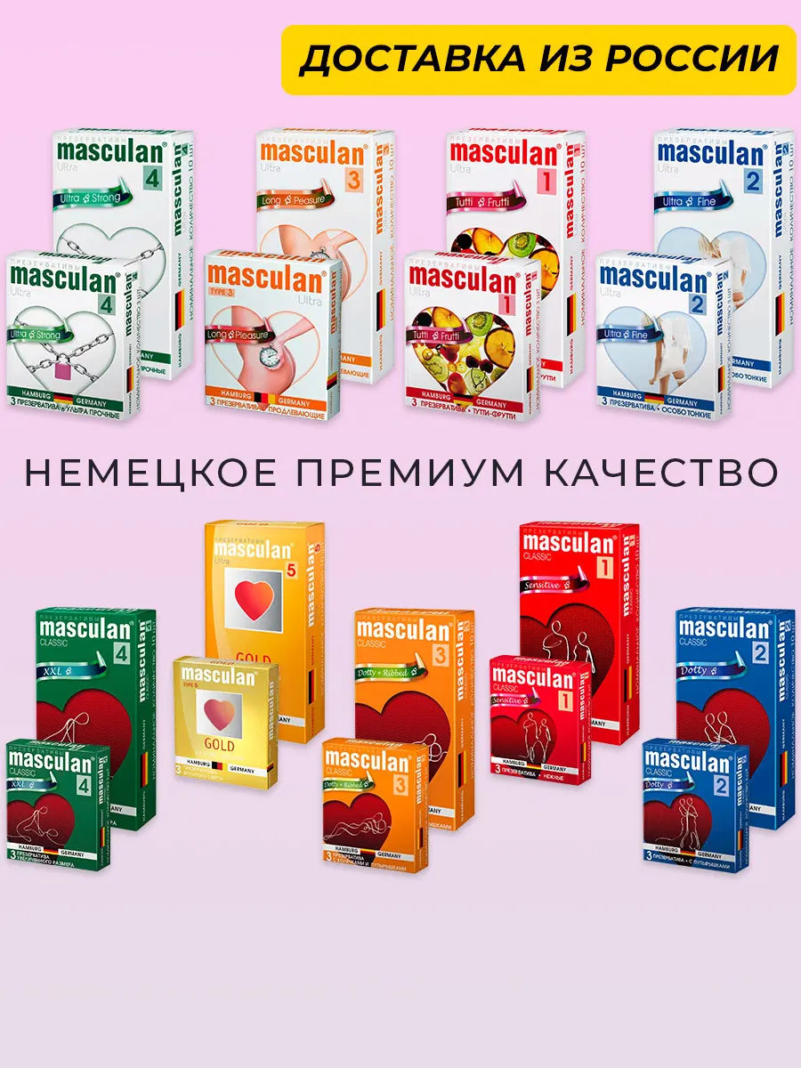 Презервативы естественного розового цвета, анатомической формы. С колечками и пупырышками, для дополнительного стимулирования ощущения женщины и мужчины. Предназначены для предохранения от нежелательной беременности и защиты от заболеваний, передающихся половым путем. Продукция Маскулан по качеству изделия и упаковки является товаром премиум класса, однако позиционируется бренд в среднем ценовом сегменте, предоставляя высокое качество изделия по доступной основной массе населения цене. Презервативы Masculan значительно превосходят требования ГОСТа по многим характеристикам (длина, сила на разрыв и т.д.).Товар сертифицирован.