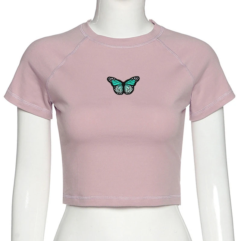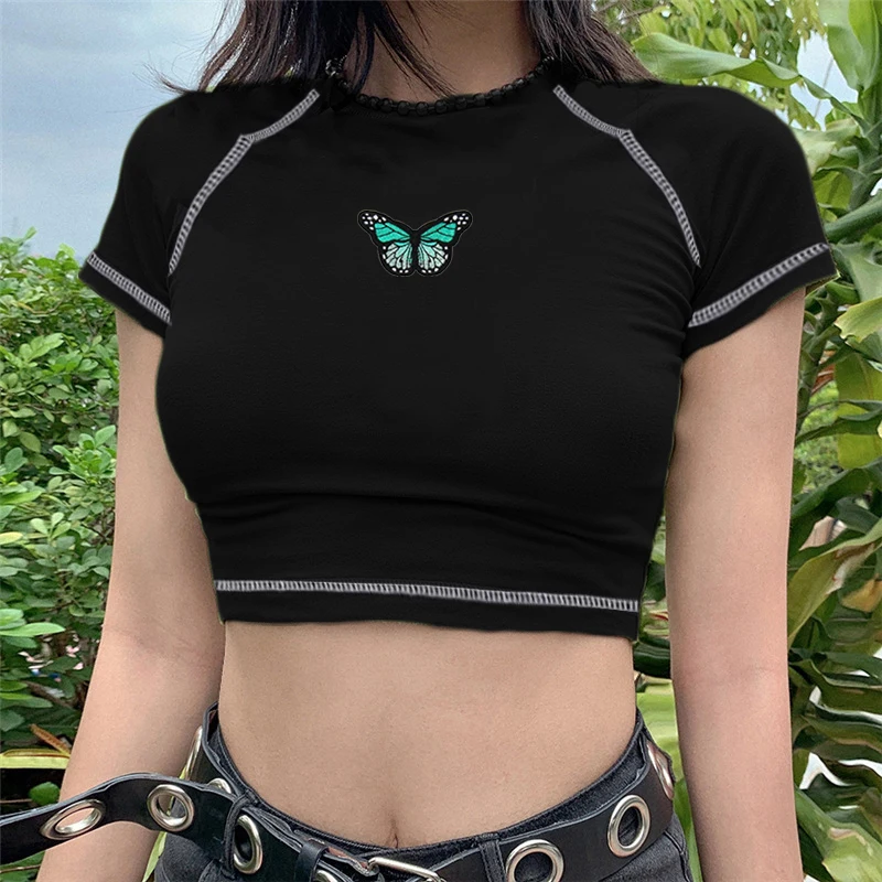 Футболка с вышивкой в виде бабочки и иконы в готическом стиле y2k, винтажная короткая футболка, уличная рубашка в стиле Харадзюку, рубашка в стиле панк, готика, рэп