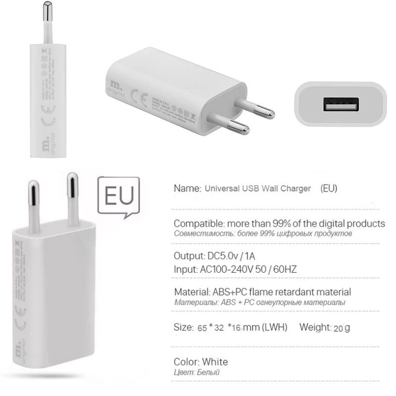 1. Avaible Цвет: белый 2. Размеры: 65,9*30,5*15,1 см 3. Вход Напряжение: 100-240 V 50/60Hz 0.35A 4. Выходное напряжение: 5 В 1.0A 5. Вес: 20 г +- 3% 6. Тип вилки: штепсельная вилка европейского стандарта