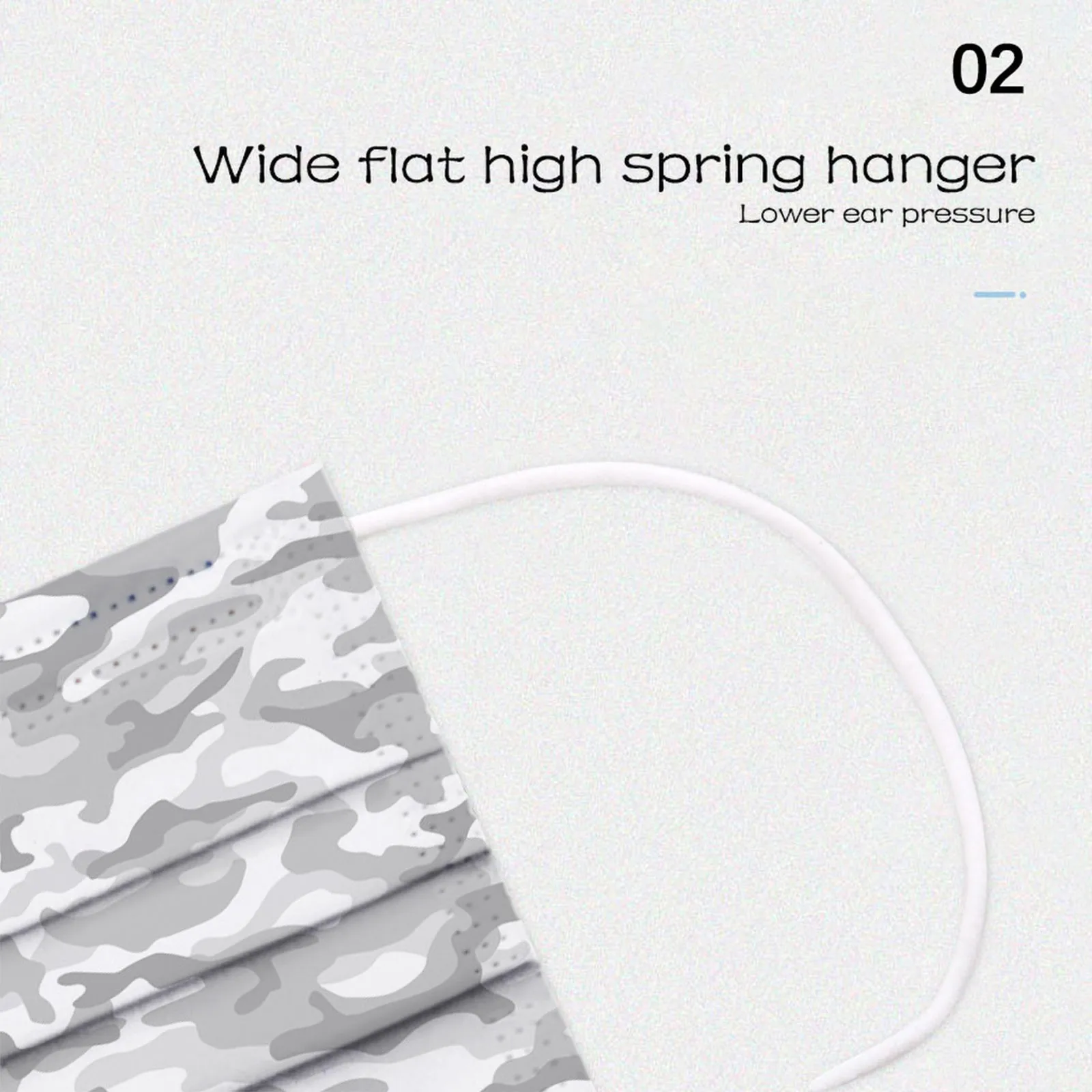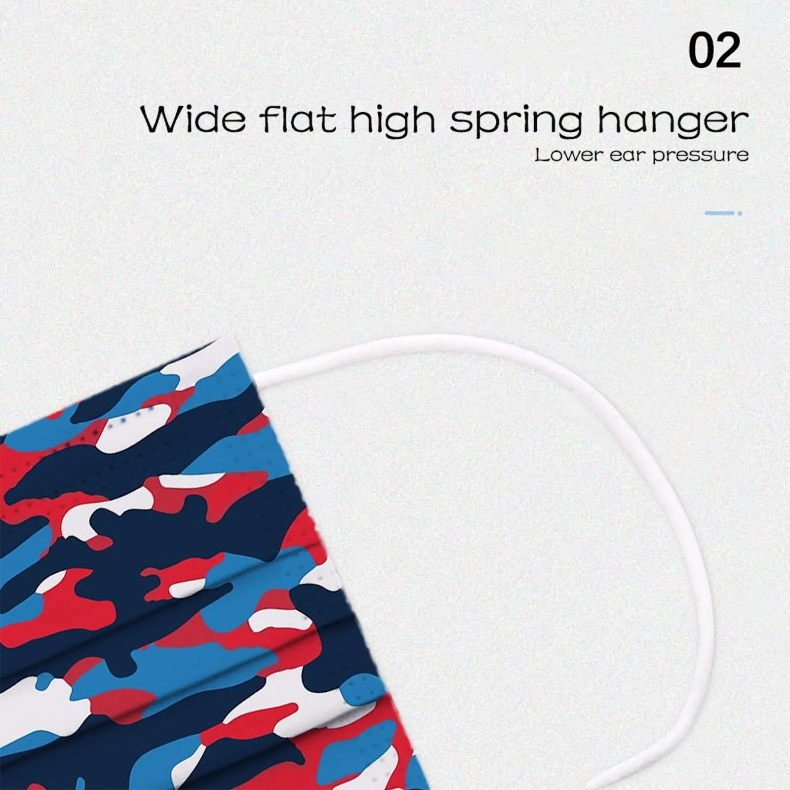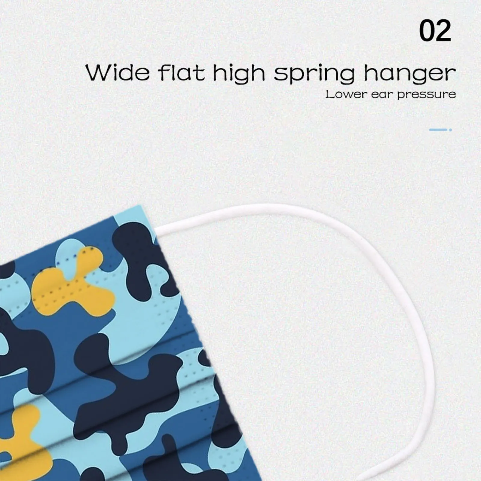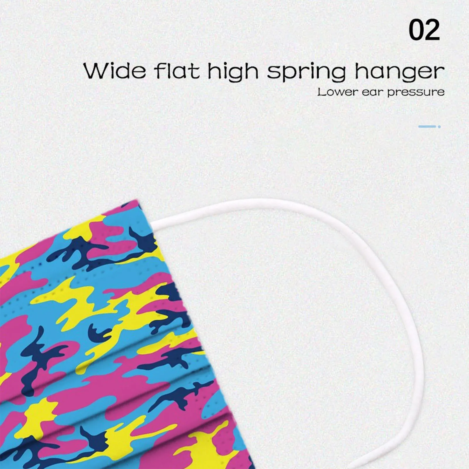 3 слояОдноразовая маска изготовлена из 3-слойного материала спанлейс,Это безопасно для здоровья и использования. Дышащий материал и милые узоры, что делает его полезным и модным. Специальная трехслойная Нетканая конструкция обеспечивает некоторую защиту от пыли, выхлопных газов автомобилей, пыльцы и т. д. эластичная петля для ушей, удобна в носке и не давит на уши. Маникюрный салон или любые другие области, где может потребоваться защита