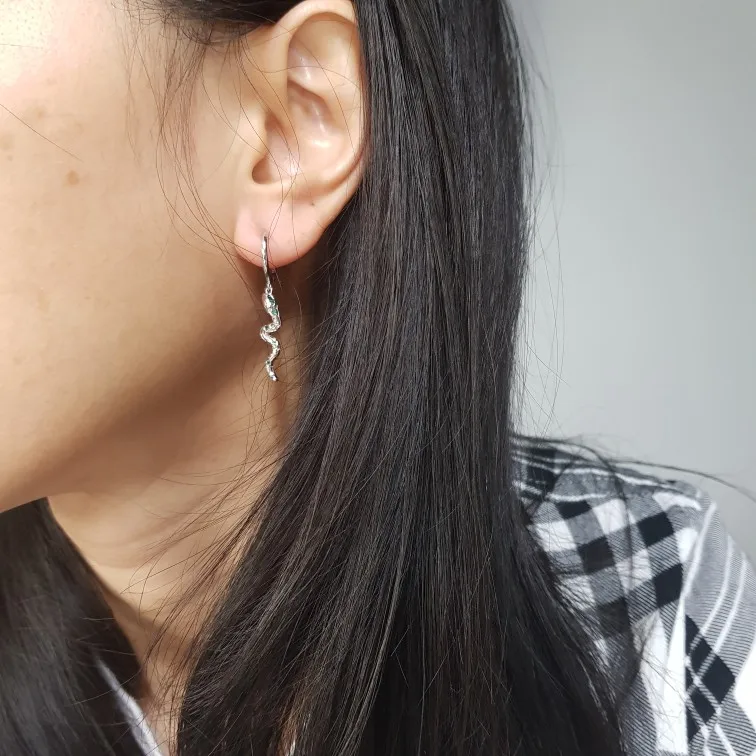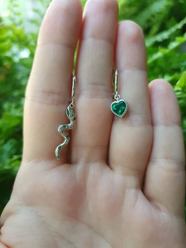 Описание: зеленый циркон символизирует лес, а асимметричные серьги украшены реалистичными змеями и любовью, создавая много воображения для ношения.