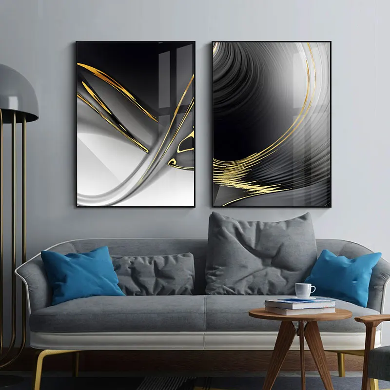 Абстрактная живопись на холсте без рамки с черными и золотыми линия...