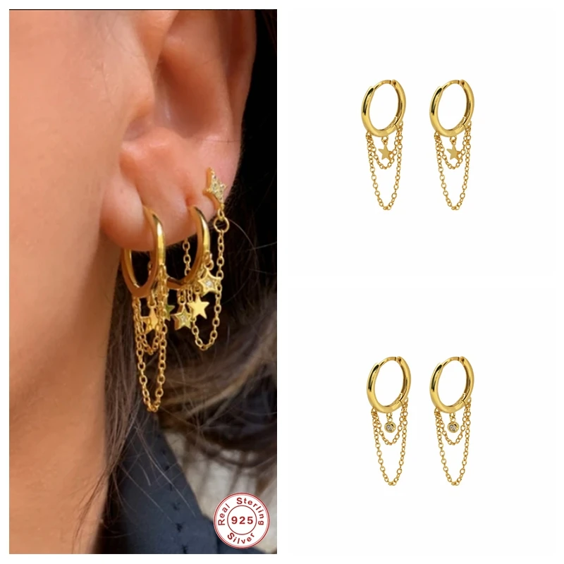 100% однотонные 925 пробы Серьги-кольца с серебряной цепочкой и кисточками, серьги-кольца со звездами, изящные украшения для женщин, женская бижутерия, Femme, очаровательный подарок