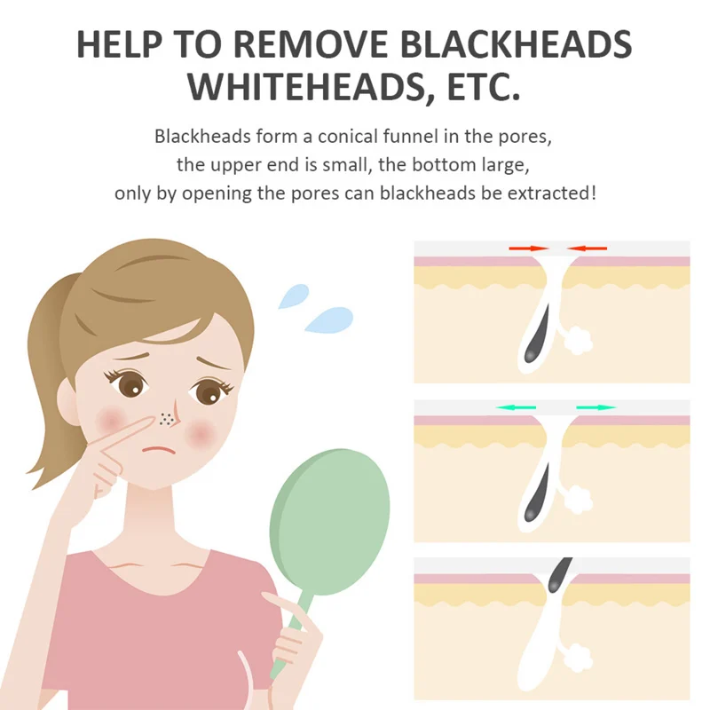 1. Высокочастотная акустическая волновая технология, через высокочастотную вибрацию распыление углубляется в поры и Удаляет излишки масла и грязи, бережная чистка без 2. При использовании его, положите изогнутую сторону вниз, мягко нажмите вперед против пор; 3.EMS микро-ток питания импорт, более эффективный; 4. Заряжайте продукт каждые 3 месяца, чтобы сохранить срок службы батареи, когда долгое время не используется.
