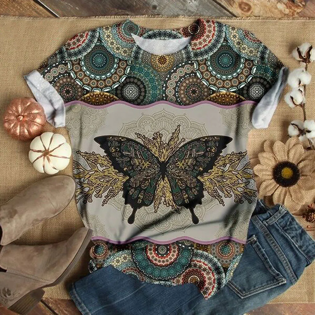 Женская блузка с коротким рукавом, принтом бабочек 3xl, размера плюс, повседневная, с круглым вырезом, топы, летние женские рубашки, винтажный Топ Женский