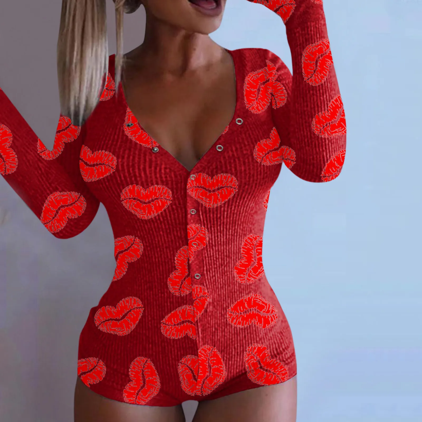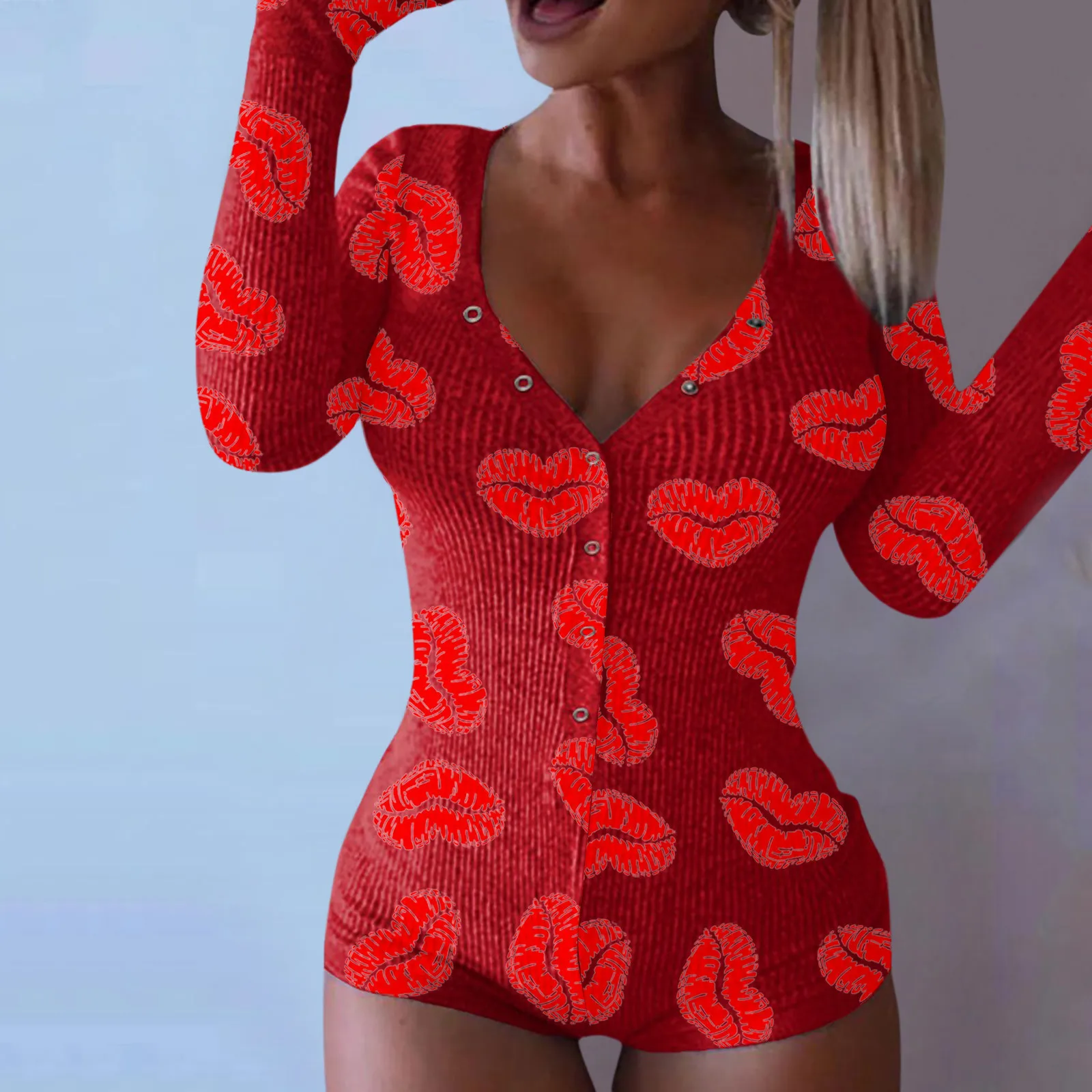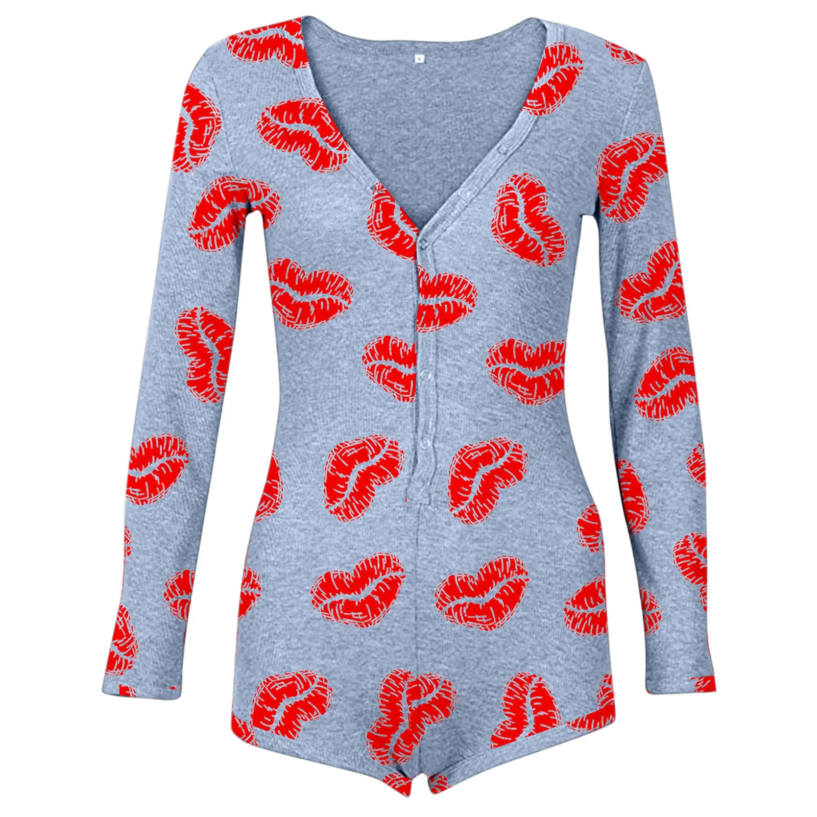 Пижама-комбинезон для взрослых, с принтом больших губ, с длинным рукавом, женская ночная рубашка, короткий комбинезон с клапаном на пуговицах, женский комбинезон # F4