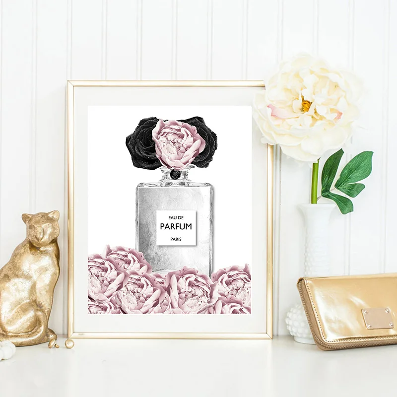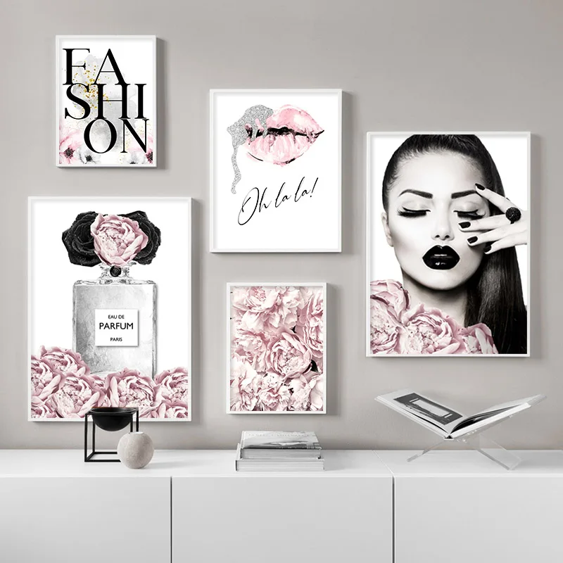 Розовый цветок духи мода леди постер Серебряные Губы Макияж Печать ...