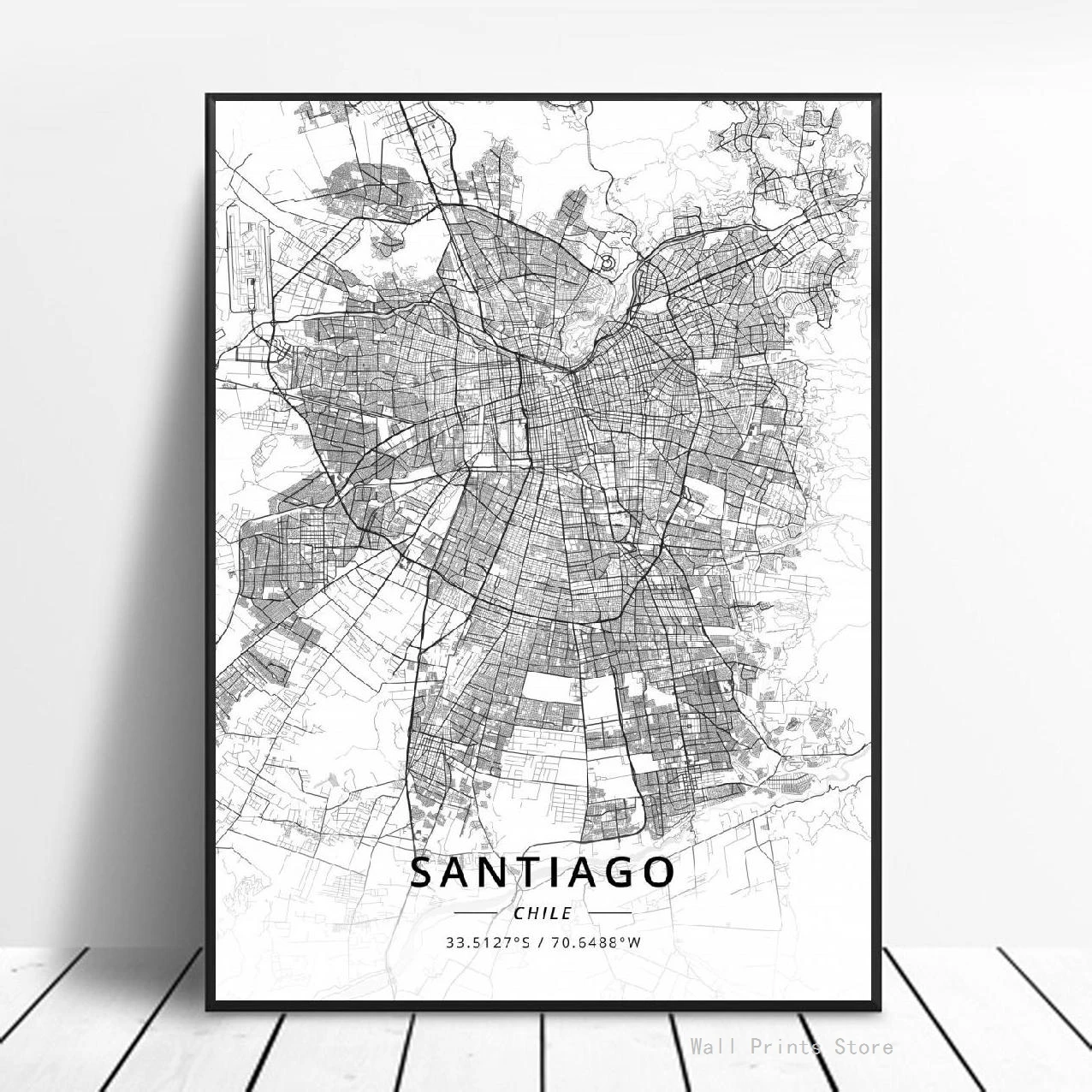 Черно-белая фотография работу в Сантьяго, Чили, карта широты, плакат, картина, искусство, холст, живопись для дома и офиса
