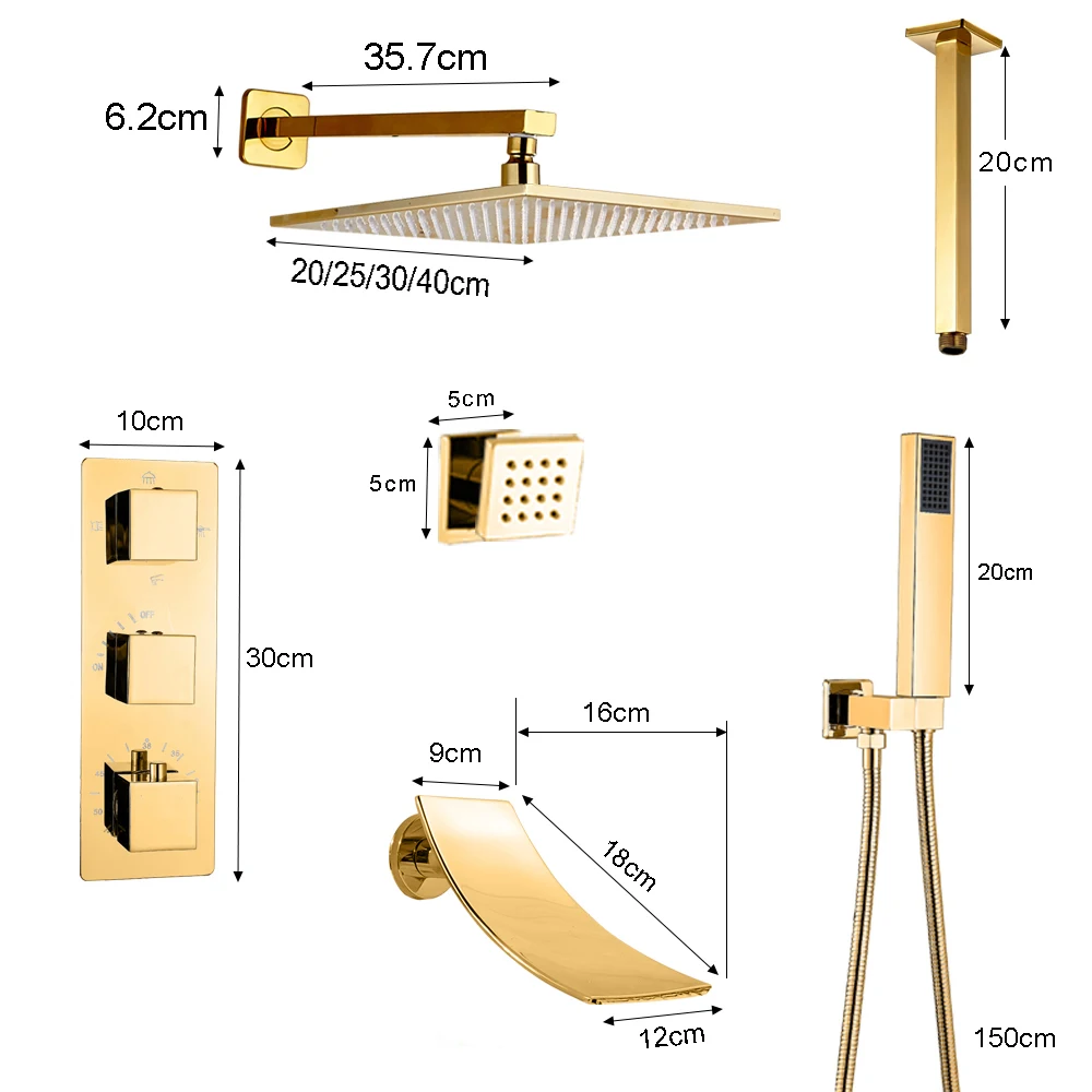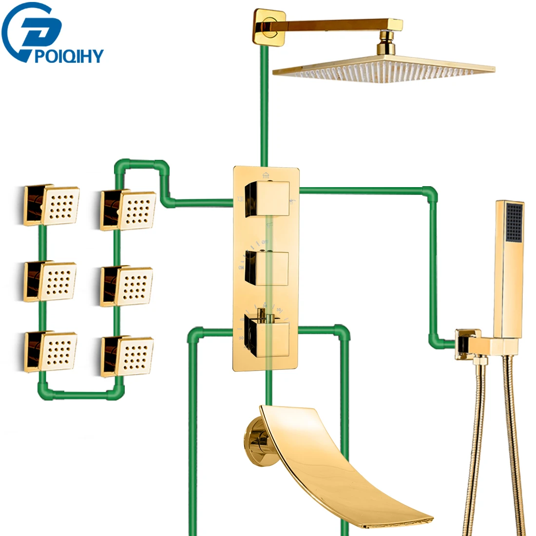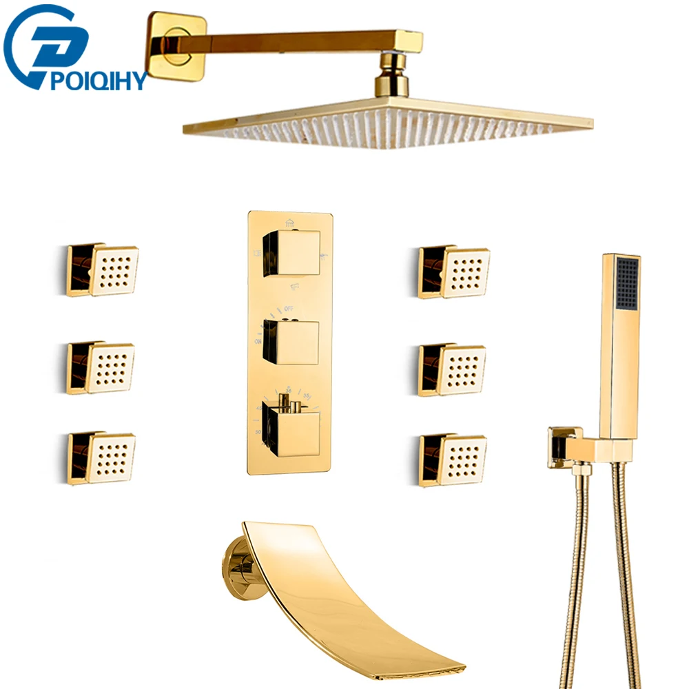 POIQIHY Золотой набор для душа Термостатический смеситель для душа кран латунный массажный струйный Водопад для ванны смеситель для душа Скрытый кран