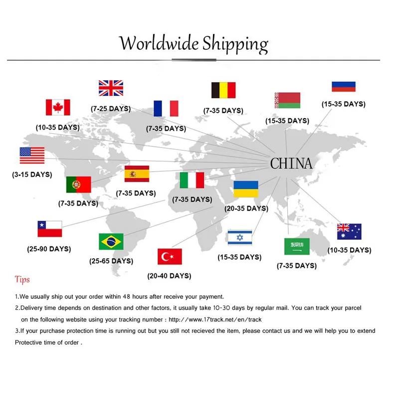 Когда вы отправите мой заказ?В течение 1-3 дней, за исключением праздников. Когда прибудет мой заказ?Скорость доставки зависит от способа доставки, который вы выбираете. Если вы не уверены, пожалуйста, спросите меня. Почему моя посылка не обновляла информацию в течение длительного времени? (основные причины указаны ниже)1. Плохая погода в пути.2. Ваш адрес и другая информация неверны.3. Пик доставки в год, многие посылки будут задерживаться более или менее дней.4. Местное почтовое отделение работает медленнее.5. Посылка может быть потеряна. Оптовая и Прямая доставка приветствуются?Да. Для оптовой продажи Мы предлагаем скидки или бесплатную Экспресс-доставку, которая занимает всего 5-12 дней.Для дропшиппинг, мы могли бы отправить товары непосредственно вашим клиентам и не оставить информацию о нас, если вы хотите. Любые проблемы с заказом, доставкой/размером/качеством, пожалуйста, свяжитесь с нами в любое время. Мы можем ошибиться, но Мы ответственная команда честности
