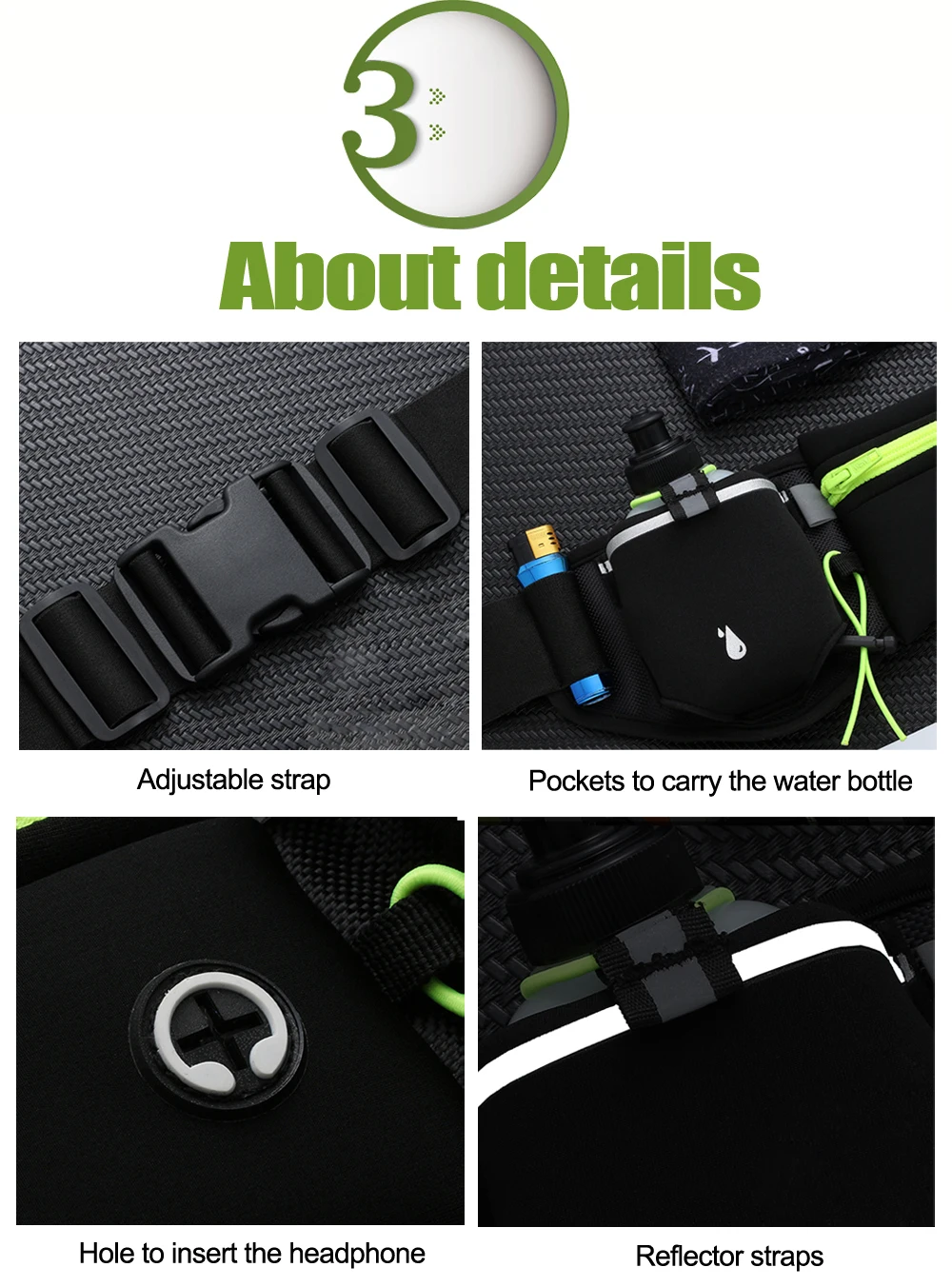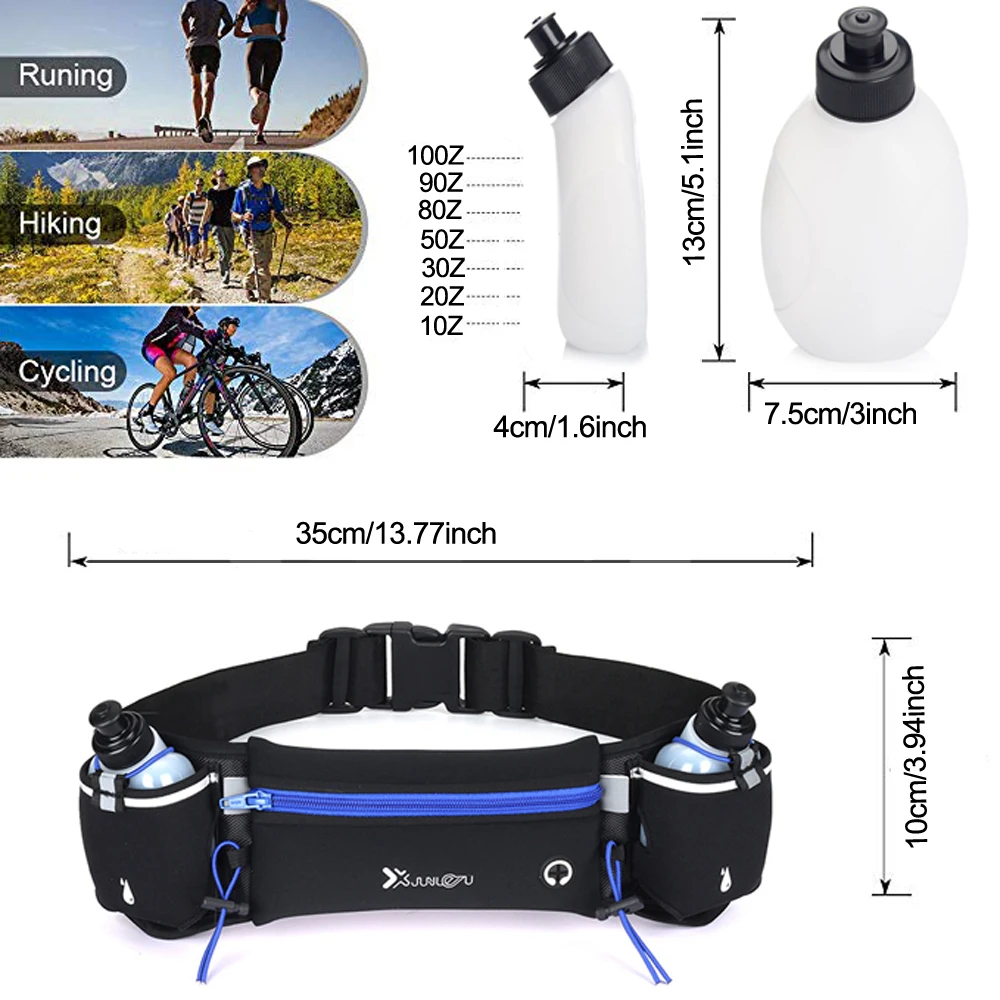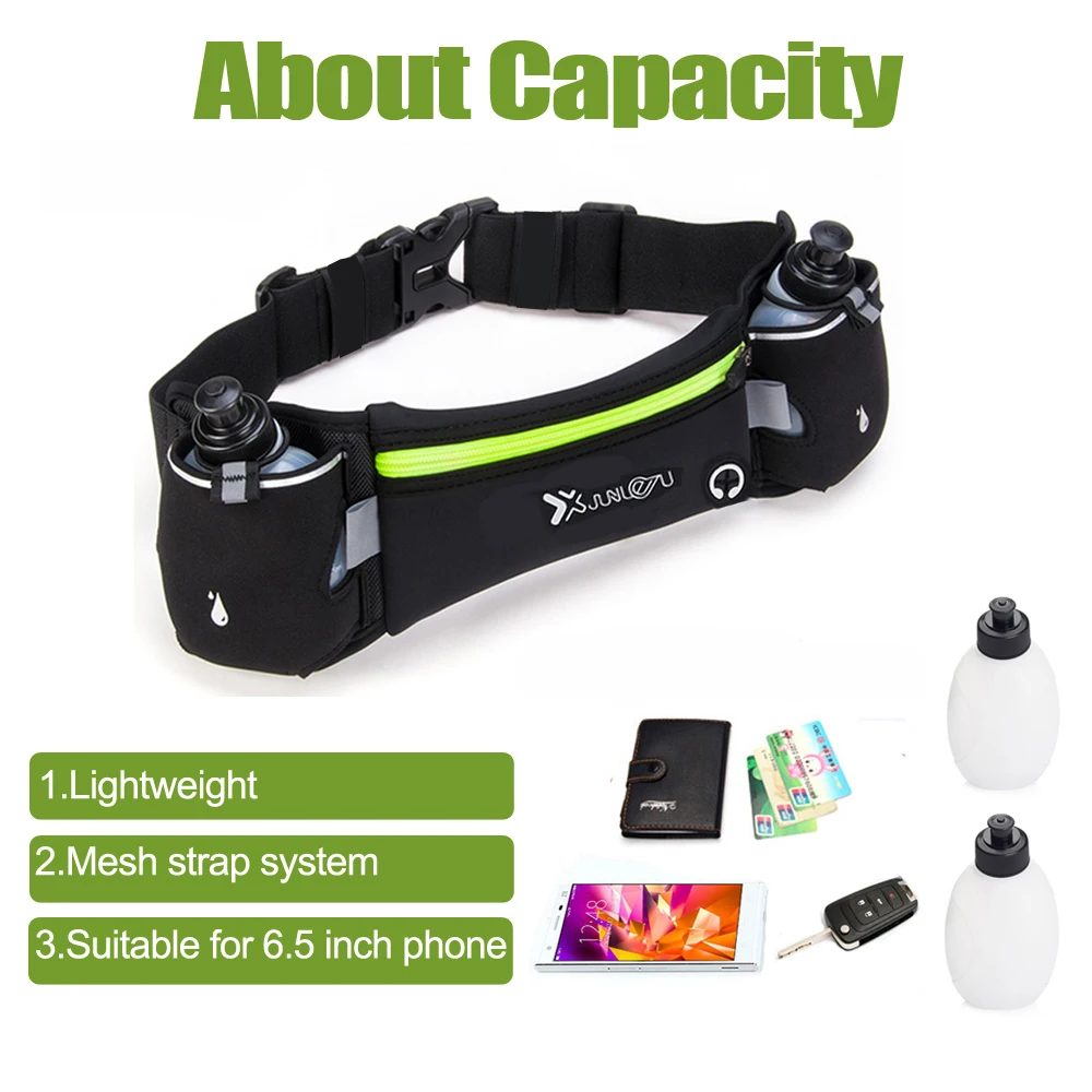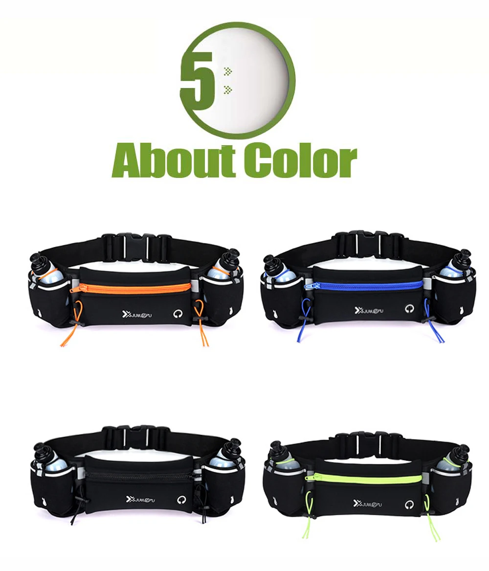 Профессиональный дизайн: 1. Регулируемый ремешок, который удобно подходит для талии от 27,6 до 59 дюймов. 2. Есть отверстие для вставки наушников, Наслаждайтесь музыкой во время работы. 3. Два дополнительных кармана для переноски бутылки с водой и ремешок над карманом можно закрепить бутылку с водой. 4. Вы заметны ночью из-за ремней отражателя, напечатанных на поясе.
