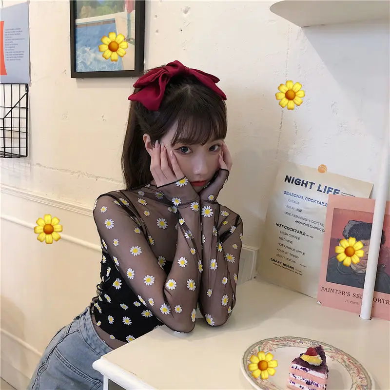 Удачу, корейский стиль сетчатый топ Дейзи нательная рубашка 2020 Новый Harajuku эстетику милое кружевное платье с цветочным рисунком, футболка с длинным рукавом и сетчатым верхом