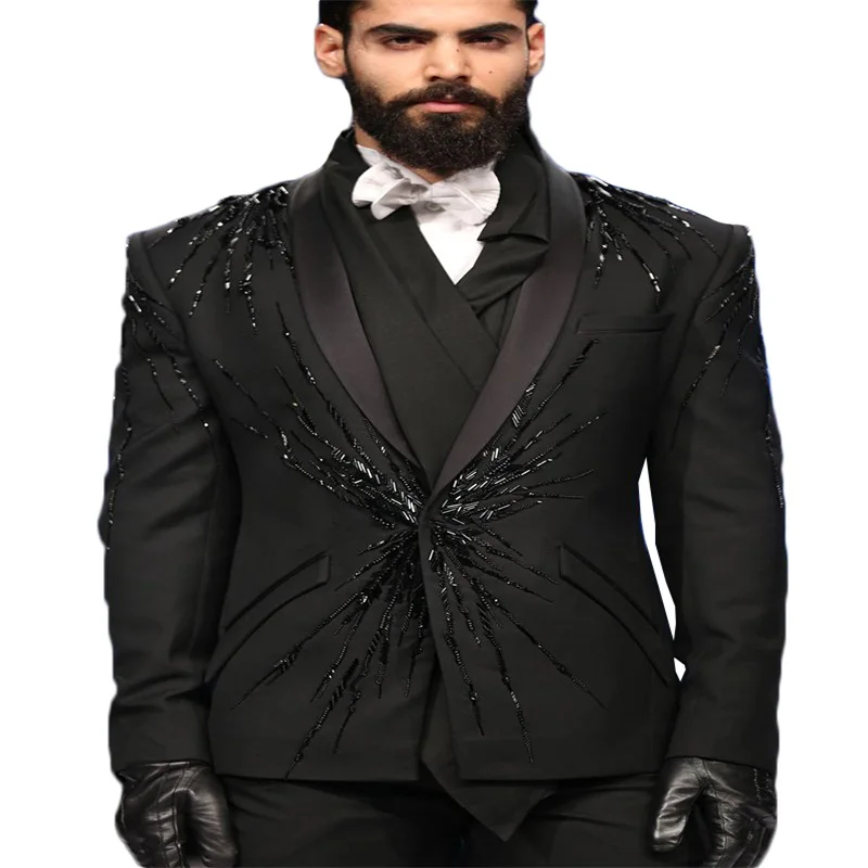 Черные мужские костюмы из двух предметов, роскошные мужские костюмы с бусинами на заказ, блейзер с одной пуговицей и брюки в деловом стиле