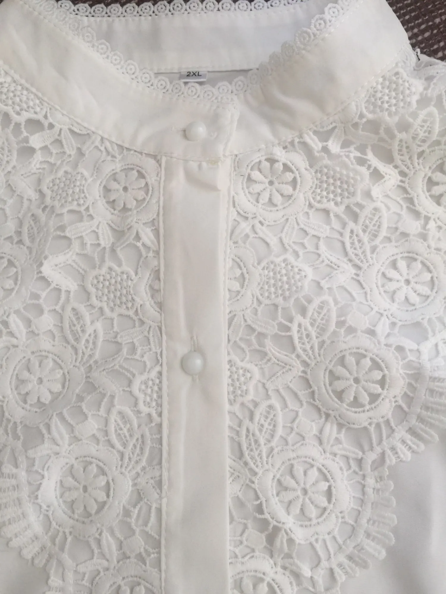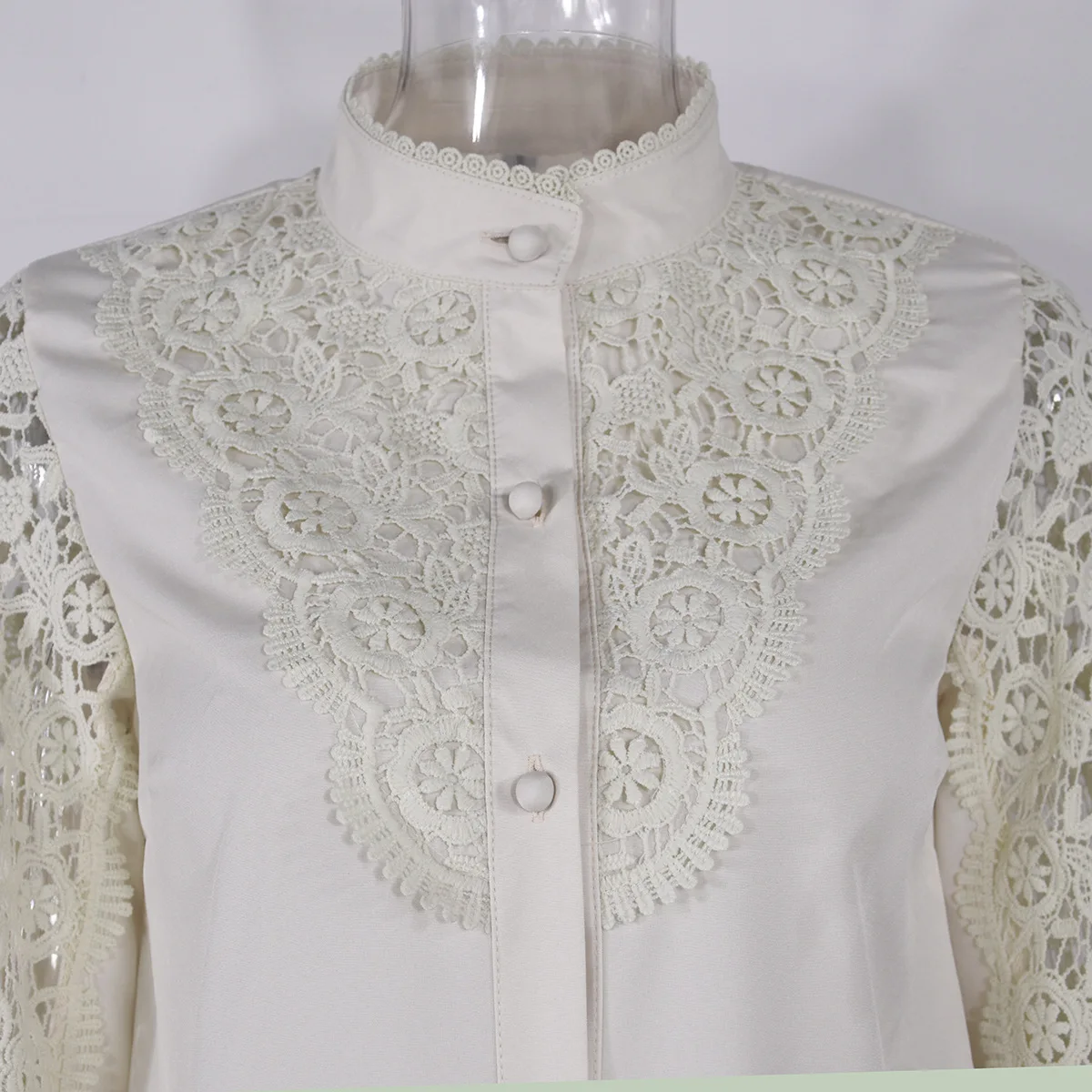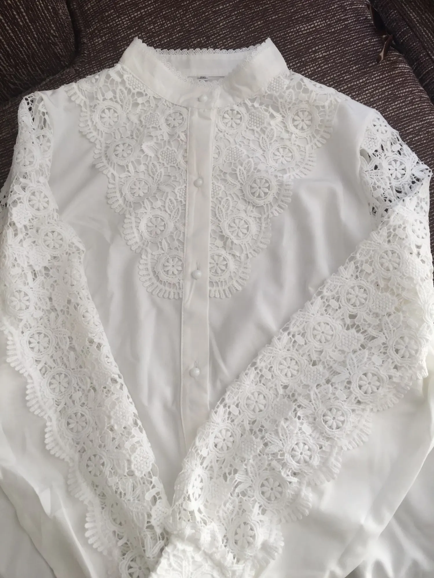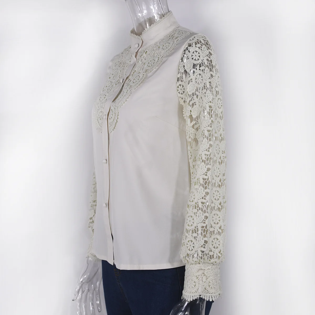 Женская кружевная ажурная рубашка, белая винтажная блузка составного кроя с длинным рукавом, круглым вырезом и пуговицами, весна 2019