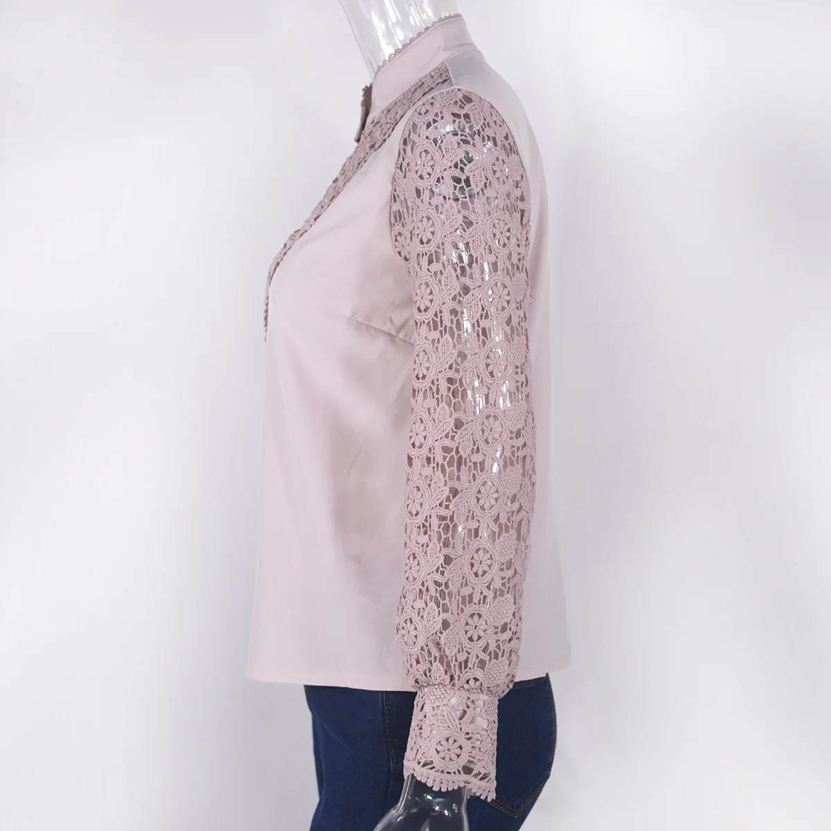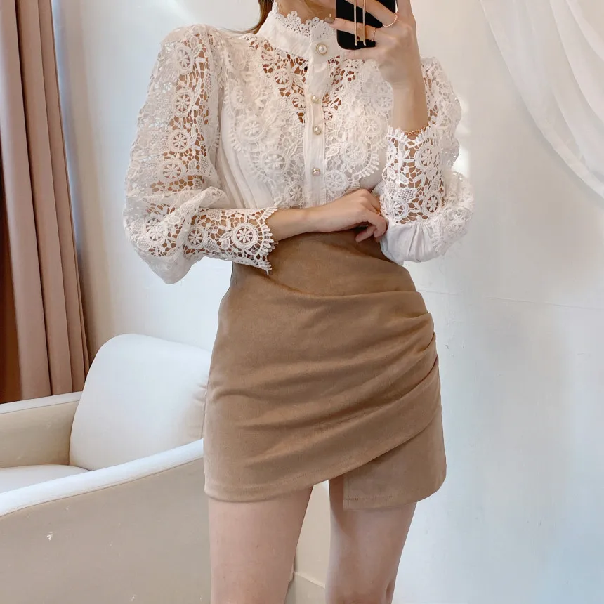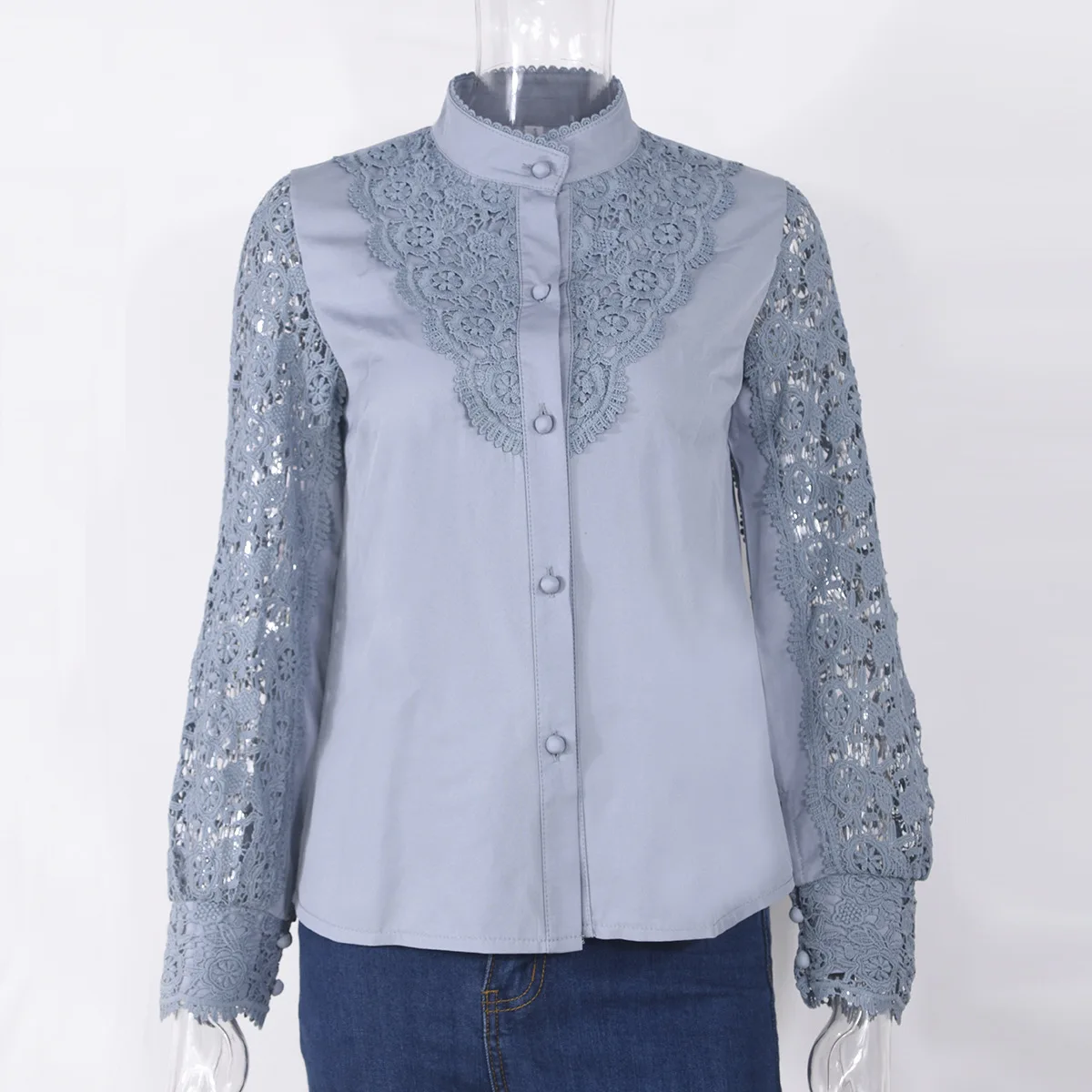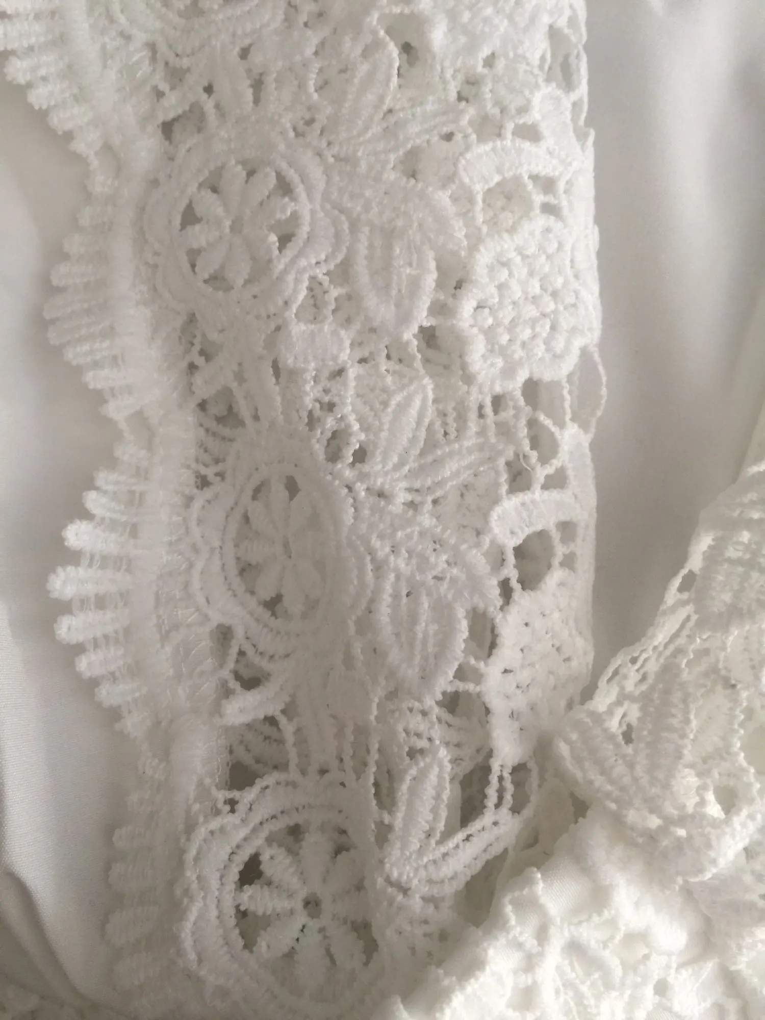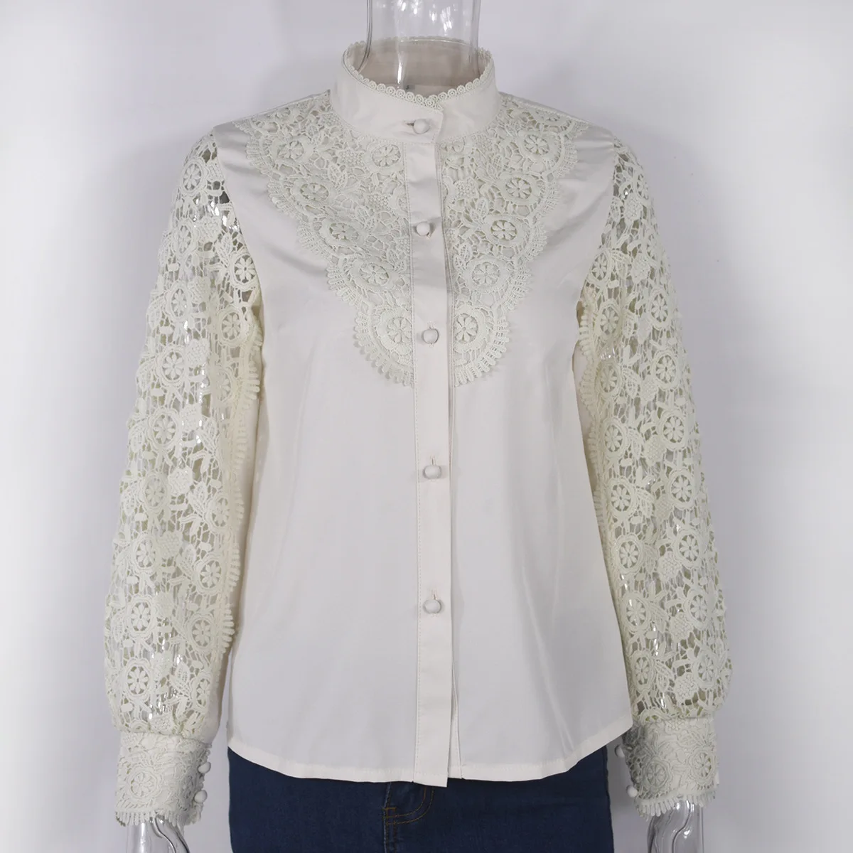 Женская кружевная ажурная рубашка, белая винтажная блузка составного кроя с длинным рукавом, круглым вырезом и пуговицами, весна 2019