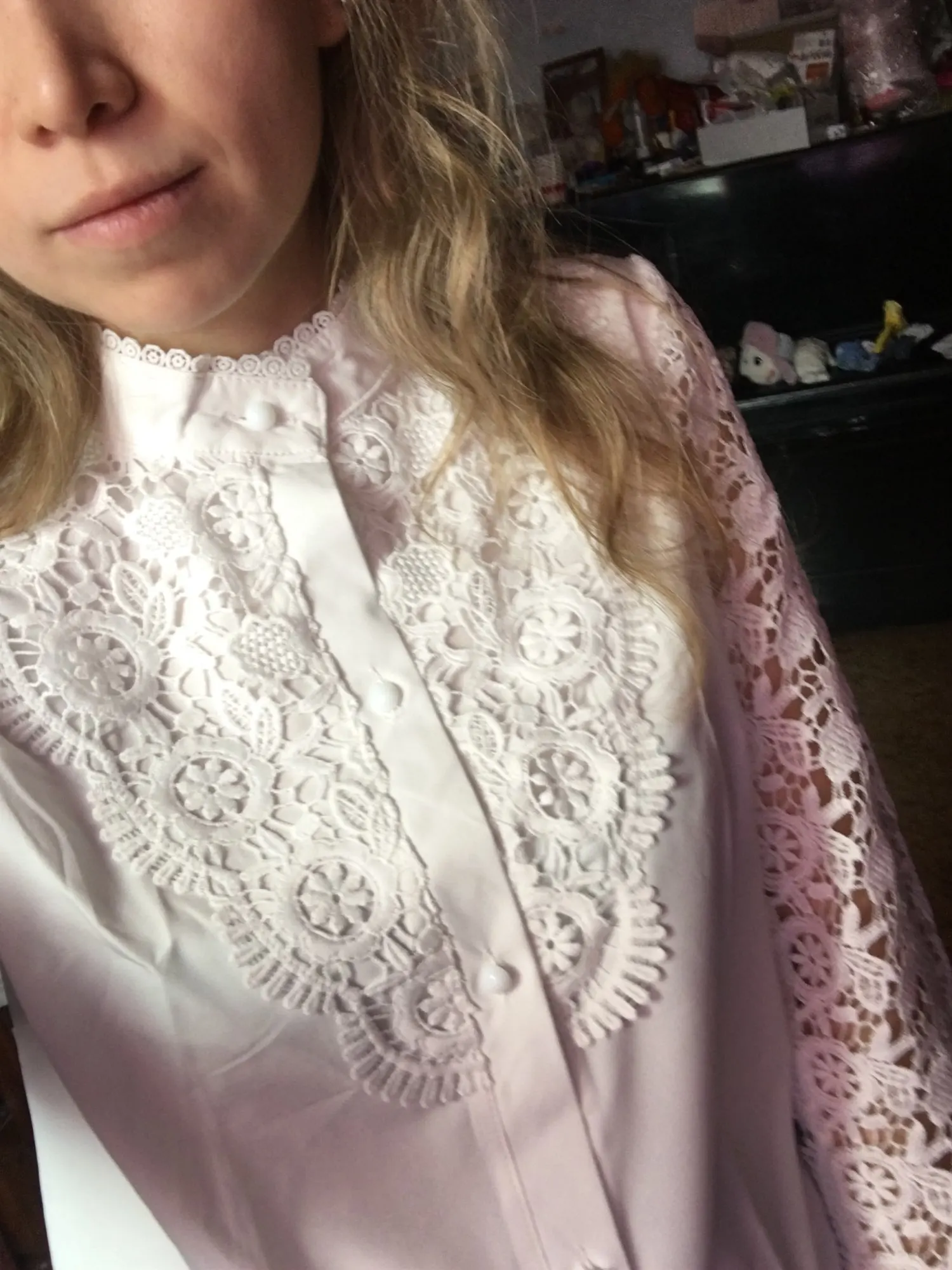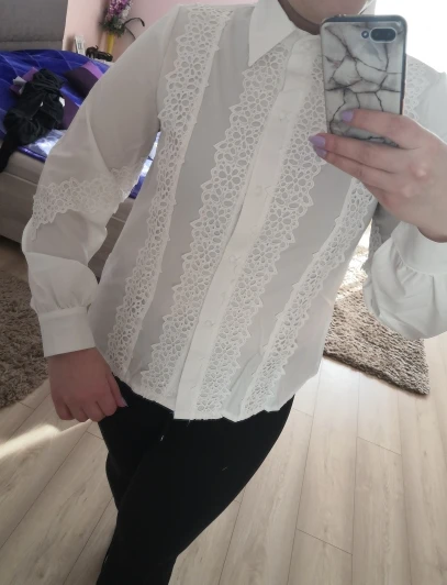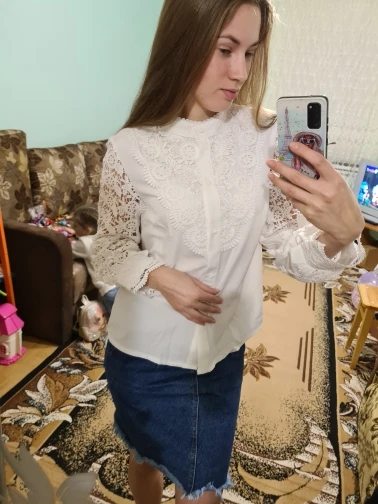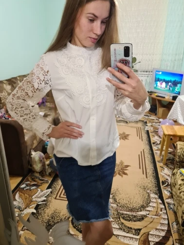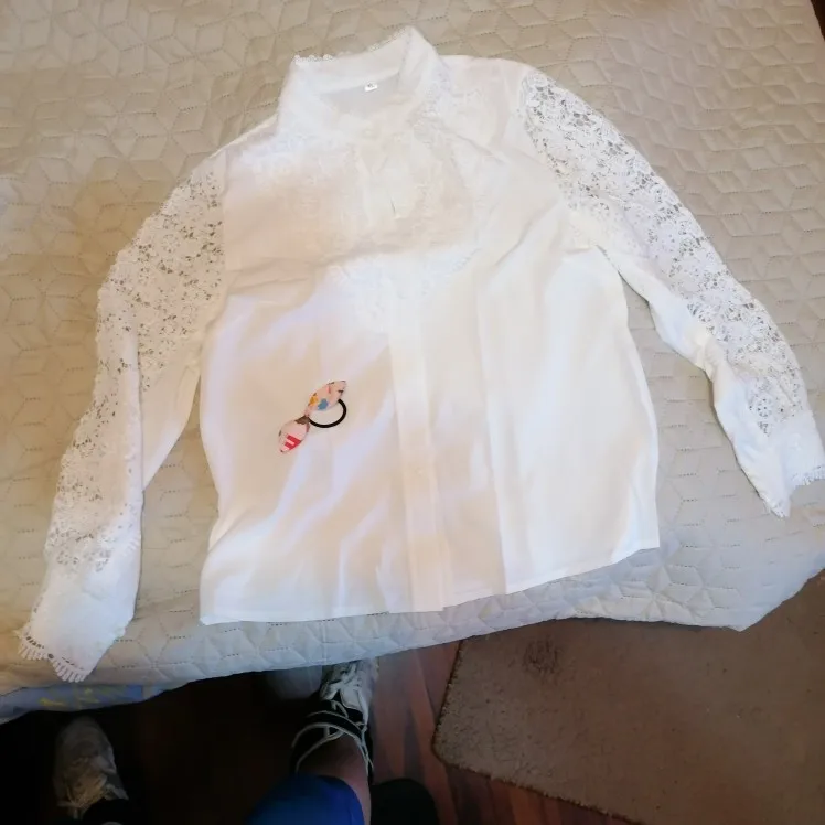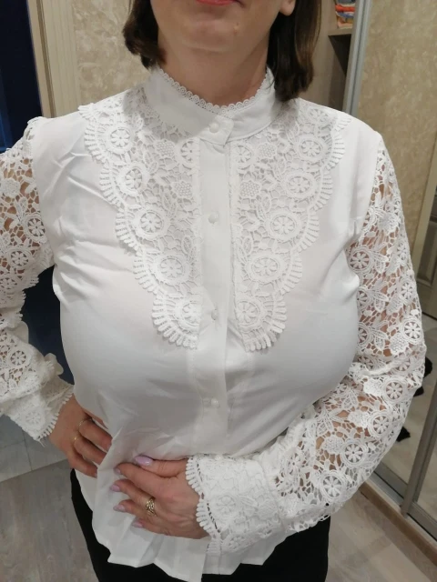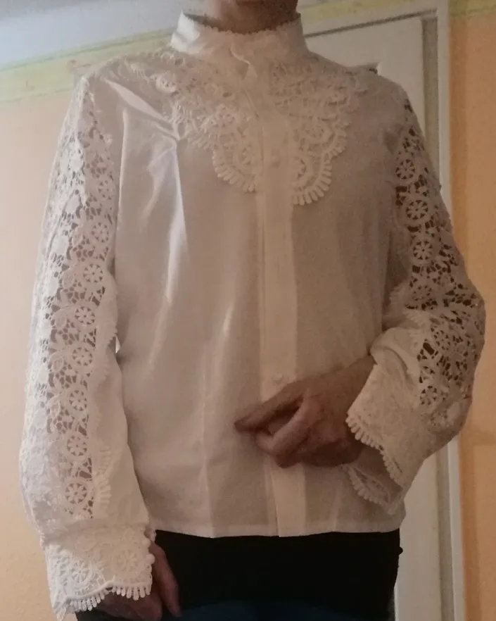Продавец очень долго не отправлял товар, блузка не такая белая как на фото, но смотрится не плохо, размер подршол, вообщем смотрится хорошо.