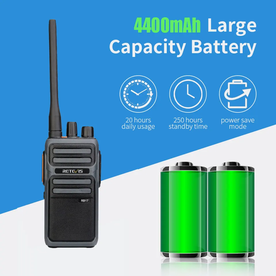 Литий-ионная батарея 4400 мАч, сильная выносливость, долгий режим ожидания, также имеет различные энергосберегающие режимы, эффективно снижают энергопотребление рации, продлевают время использования, нормальное время использования 8-10 ч, Время в режиме ожидания может достигать 72 ч.