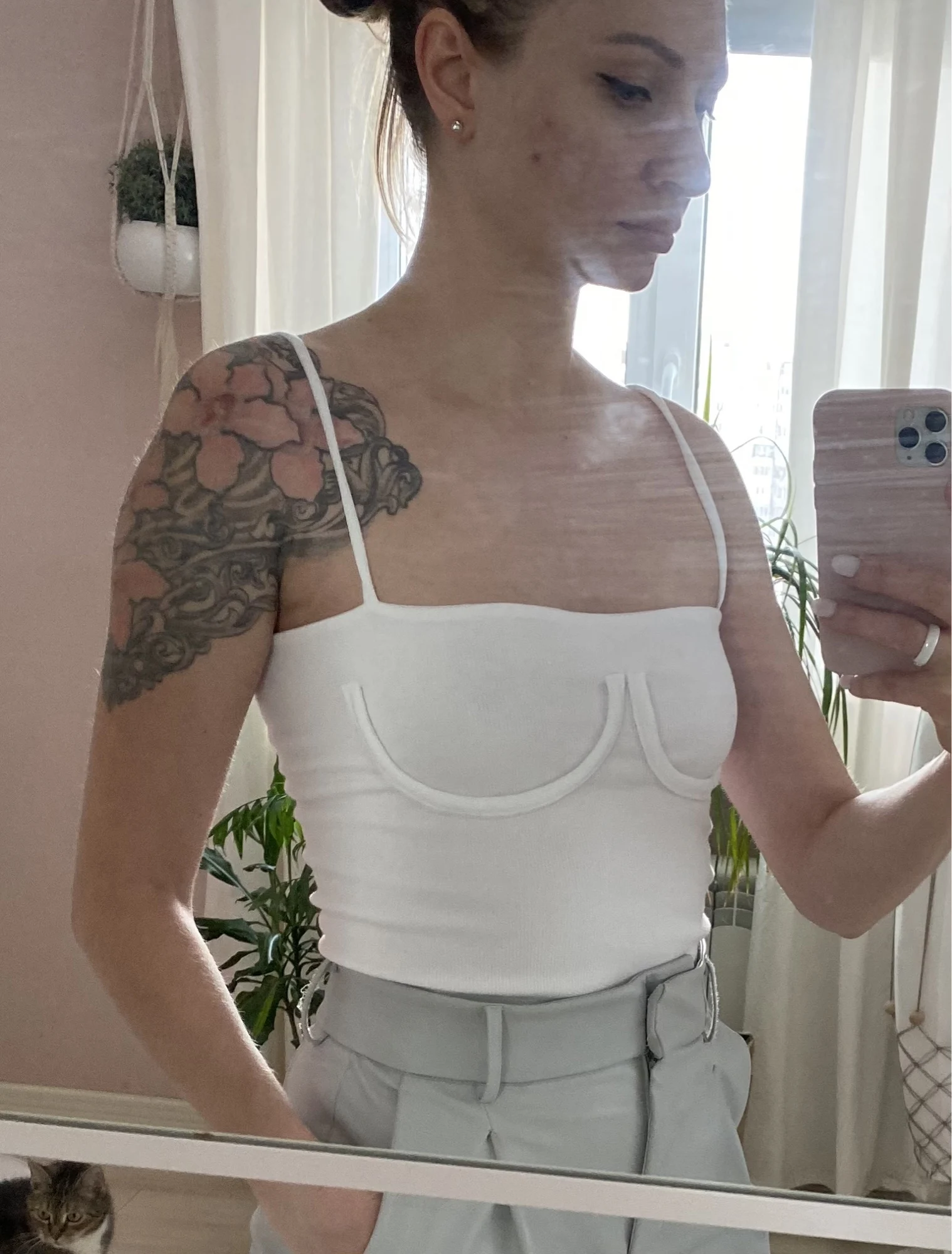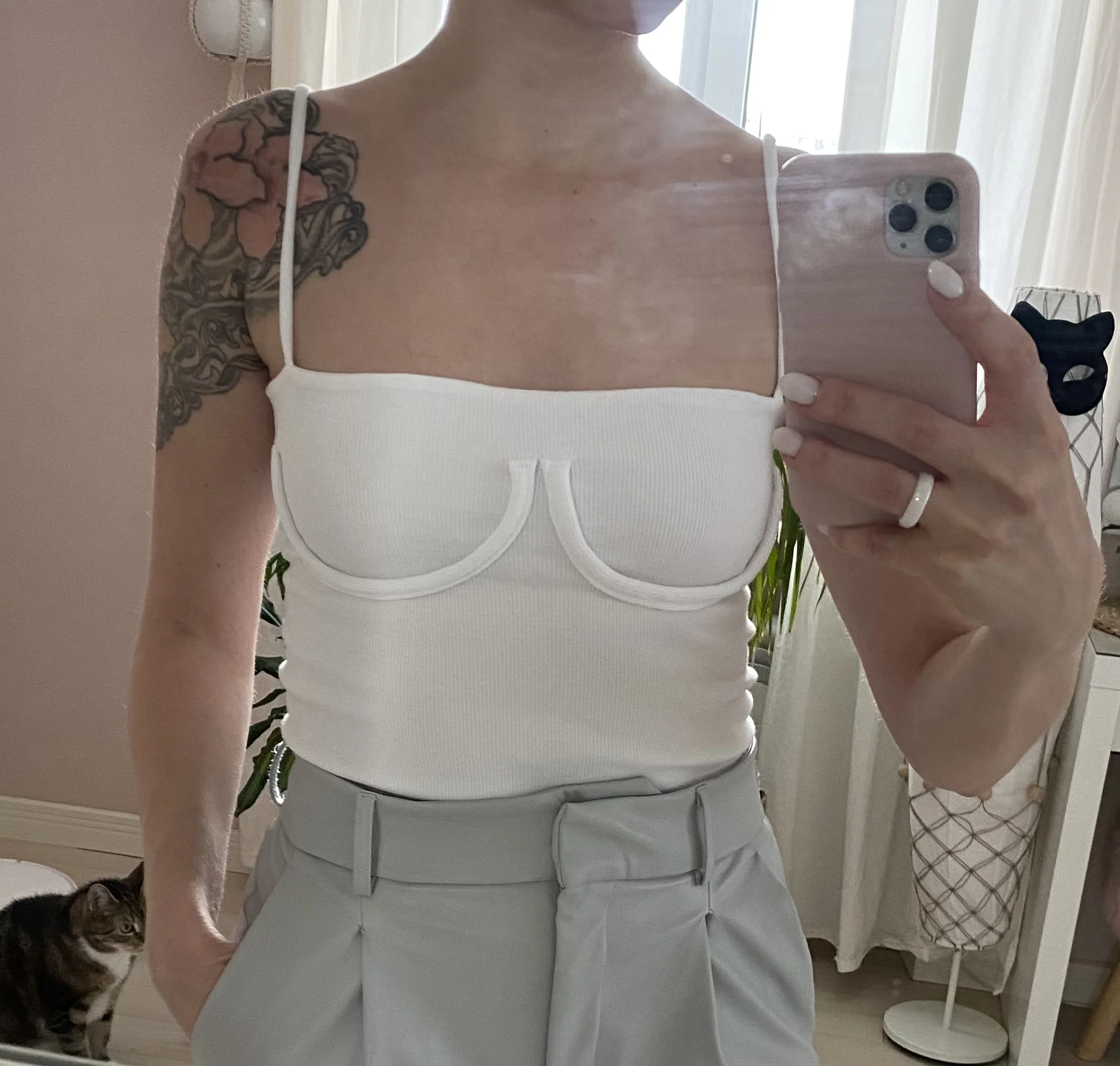 Отличный топ, смотрится дорого, чашечки легли чётко под грудью, ткань в два слоя, поэтому можно носить без бюстгальтера, ничего не выделяется и не просвечивает. Ткань очень хорошая, в рубчик, в составе 35% хлопка. Очень комфортно на теле, кожа дышит. Базовая вещь. Будет отлично как с джинсами, так и с брюками. Планирую носить под пиджак. Очень довольна покупкой. Долго выбирала эту модель в разных магазинах и не прогадала, тут самое лучшее исполнение. Берите, не пожалеете. В размер на обхват груди 86 см, хорошо тянется. Это любовь ❤️