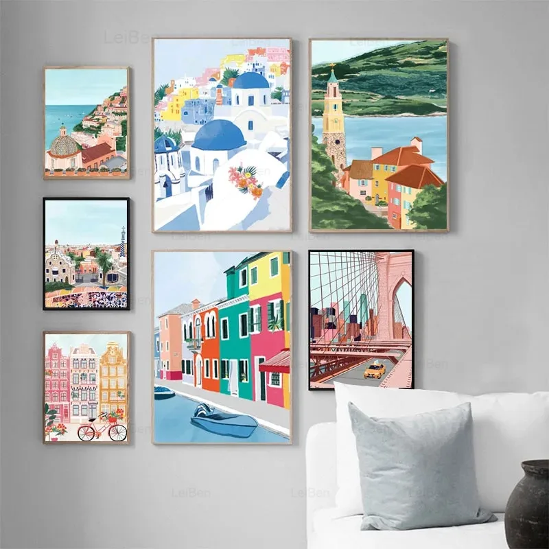 Аниме город путешествия плакат Барселона Санторини Италия Япония хо...