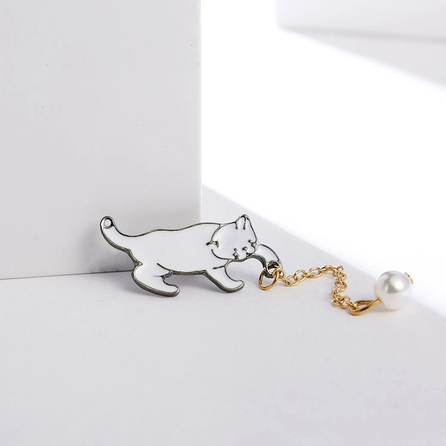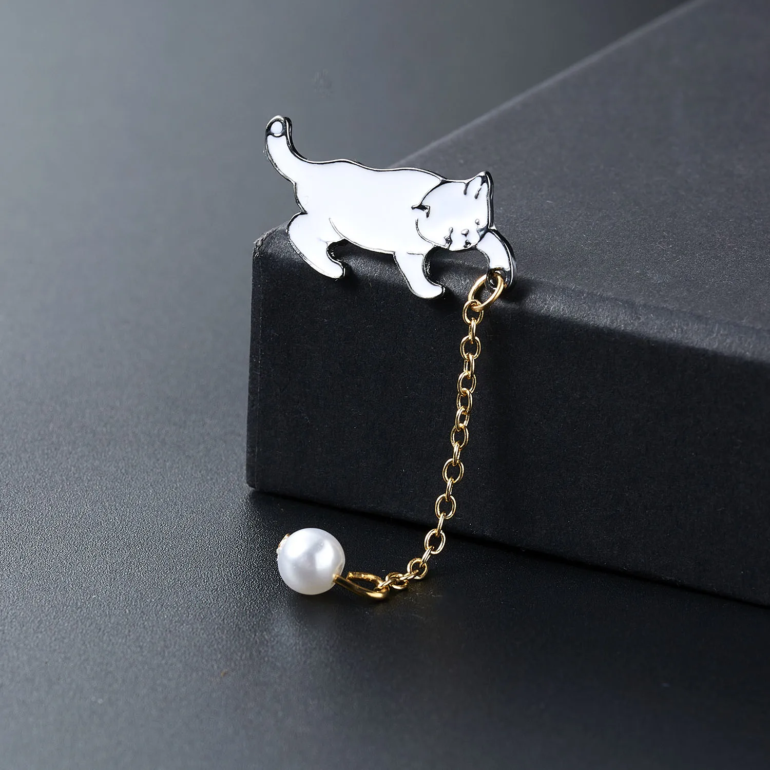 Милая простая белая брошь-подвеска в виде кота с жемчугом, эмалированная краска, длинная брошь на цепочке для женщин и девушек, модное ювелирное украшение в виде животных